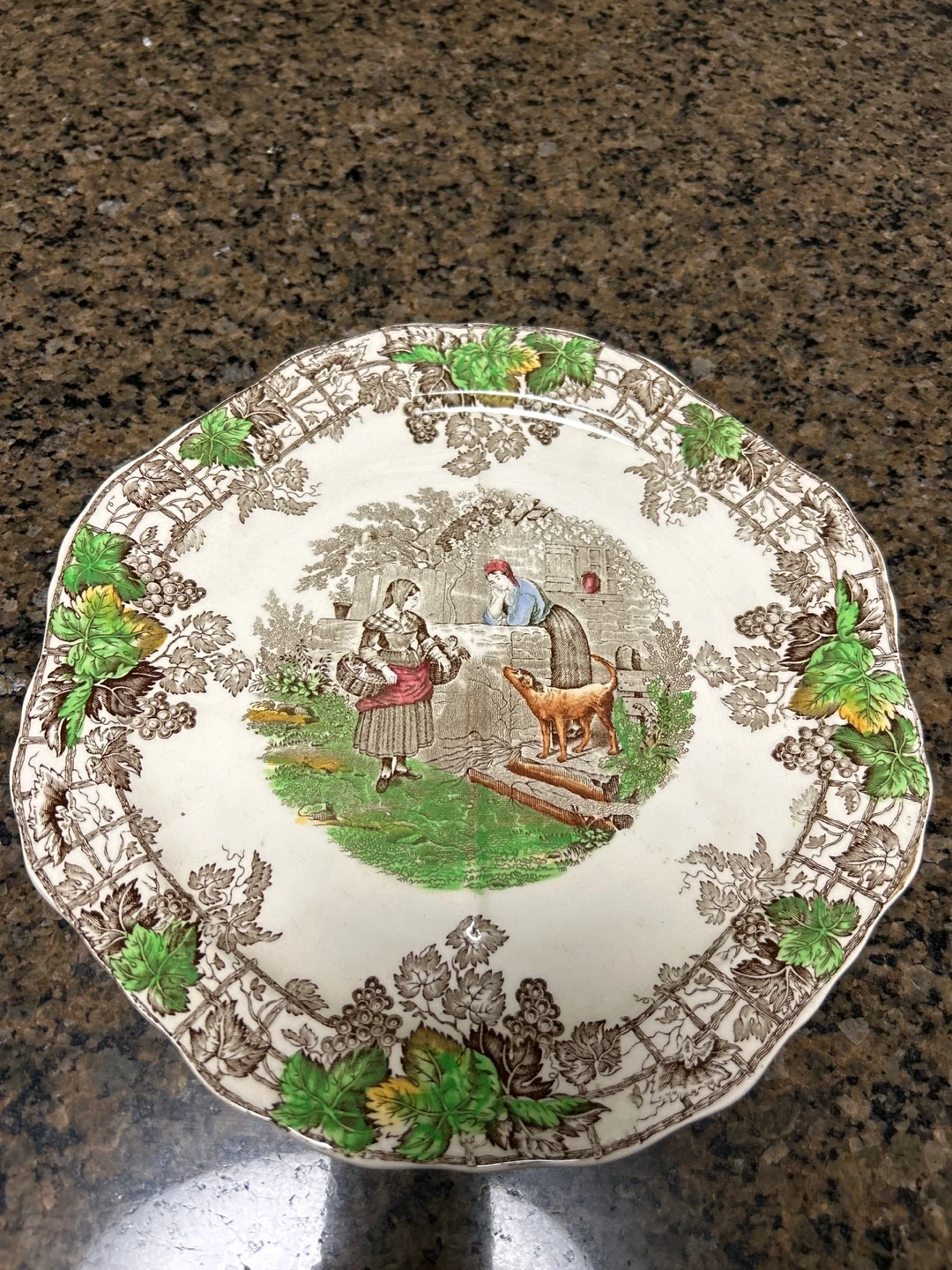 Selling a lovely plate from Spode's Byron Series No. 1. It features a charming scene with people and a dog in a garden setting, surrounded by a decorative border of leaves and grapes. A beautiful addition to any collection or a unique piece for display!
