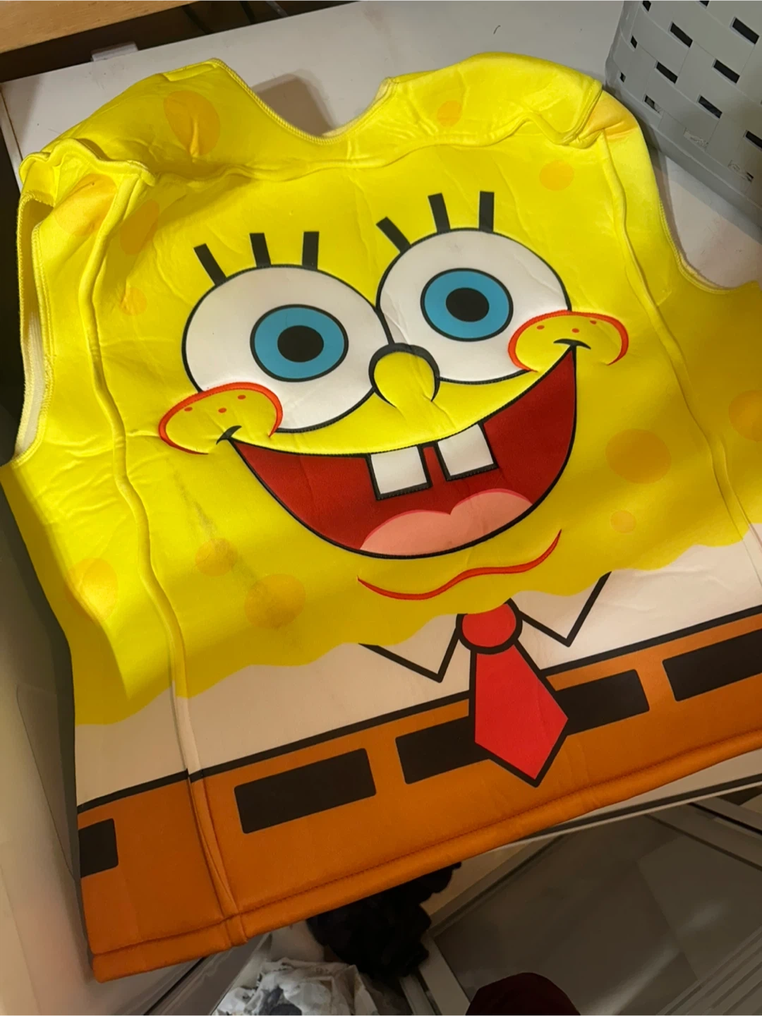 Spongebob Squarepants costume vest, perfect for a fun occasion! The vest is yellow with Spongebob's face on the front, complete with his signature smile and tie