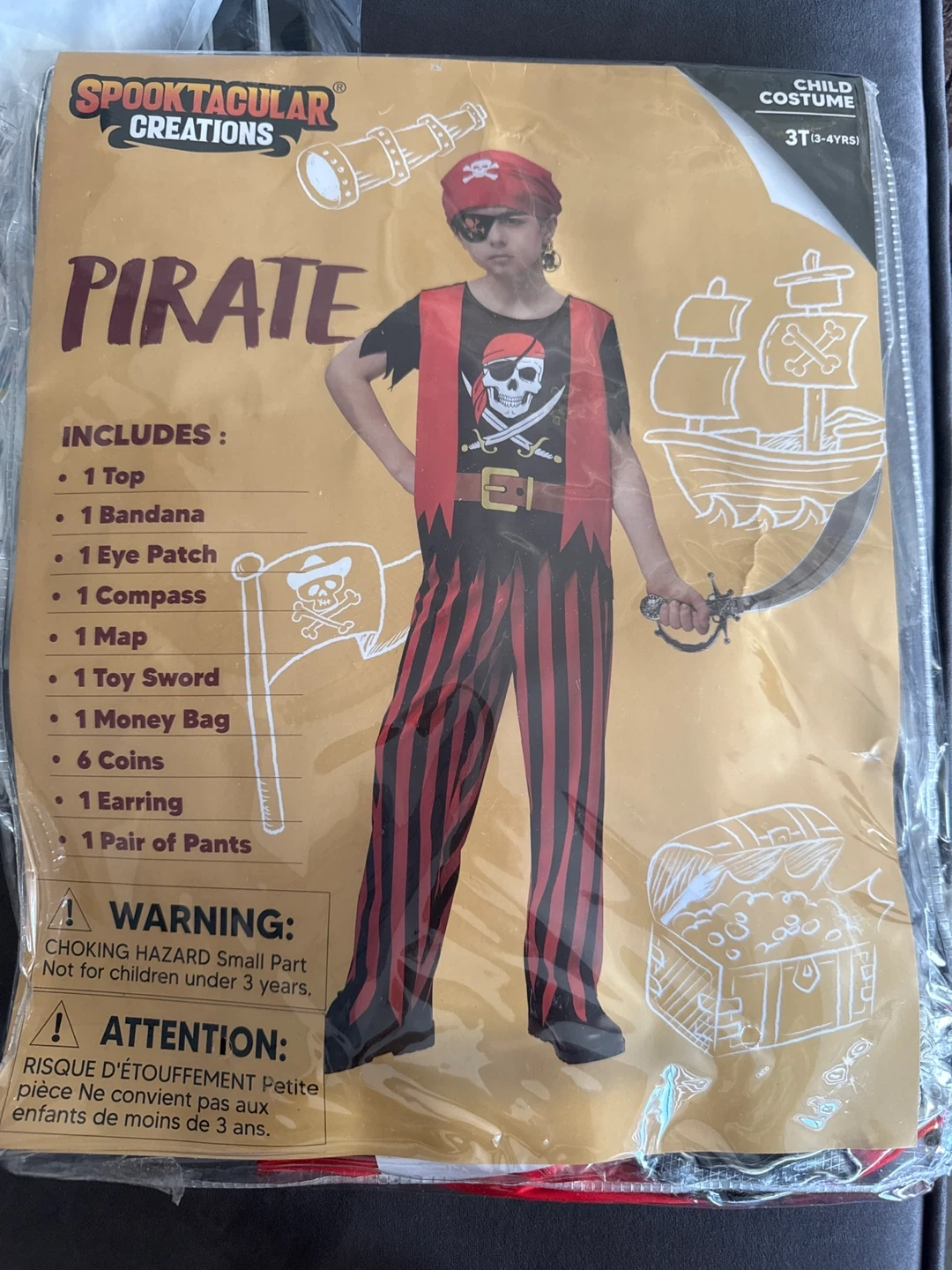 brand new Spooktacular Creations Pirate Costume, perfect for your little one. This costume is size 3T (3-4 years) and includes everything your child needs to become a swashbuckling pirate: - 1 Top - 1 Bandana - 1 Eye Patch - 1 Compass - 1 Map - 1 Toy Sword - 1 Money Bag - 6 Coins - 1 Earring - 1 Pair of Pants