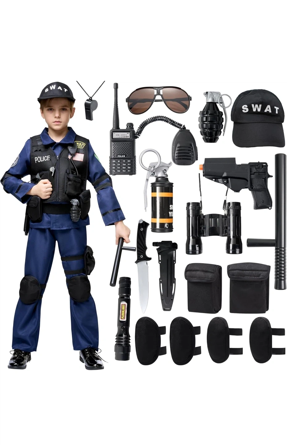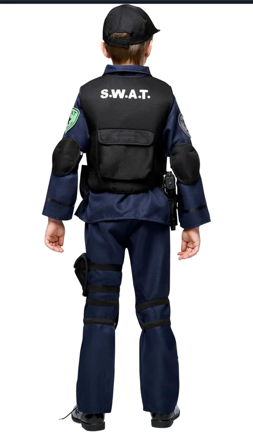 Get your little one ready for action with this Spooktacular Creations SWAT costume! It's a size MEDIUM and includes everything they need to look the part: - Vest - Shirt - Belt - Whistle - Grenade - Pair of Pants - Toy Handcuffs - Toy Knife - Toy Baton - Toy Walkie - 2 Knee Pads - 2 Ammo Pouches - Pair of Sunglasses - Toy Gun - Binoculars * NEW *