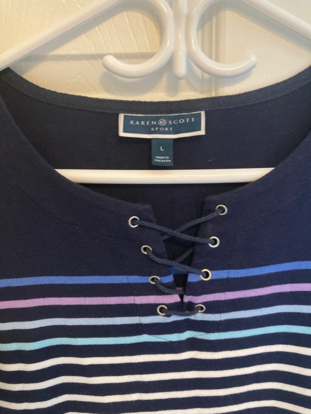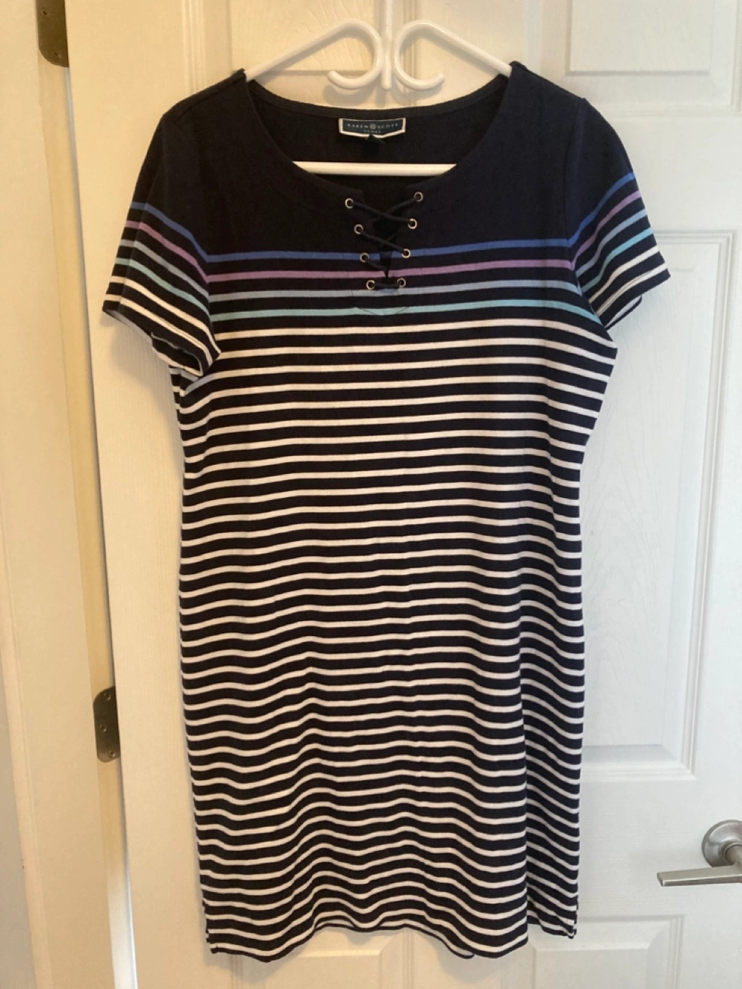 Navy blue and pastel striped t-shirt dress. Features a lace-up neckline. Short sleeves. Size large.