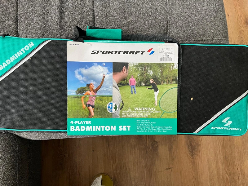 Get ready for some fun in the sun with this Sportcraft 4-player badminton set! It includes four tempered steel rackets and two molded shuttlecocks. The set also has double guide support ropes with stakes and tension clips, plus PVC poles that are 61 inches (1.5m) in height. The sleeve style net is 20 ft x 1 1/2 ft (6.1m x 46cm)