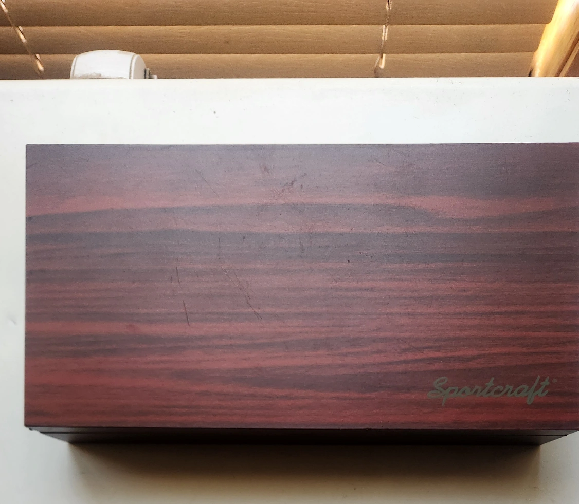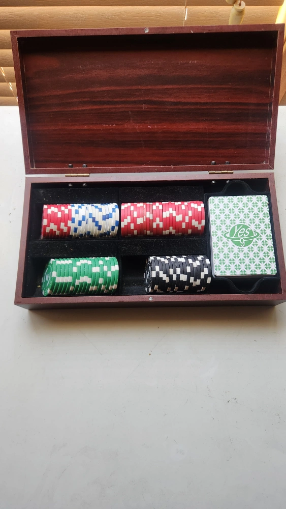 Selling a Sportcraft poker set, complete with a wooden case. It includes an assortment of poker chips in different colours (red, white, green, and black) and a deck of cards. Great for a fun game night with friends and family!