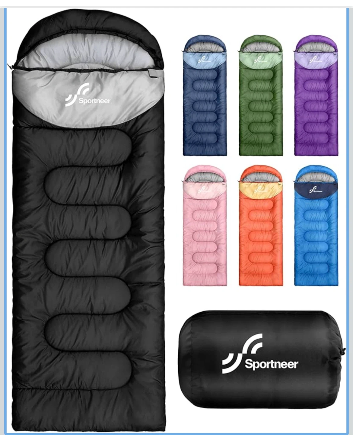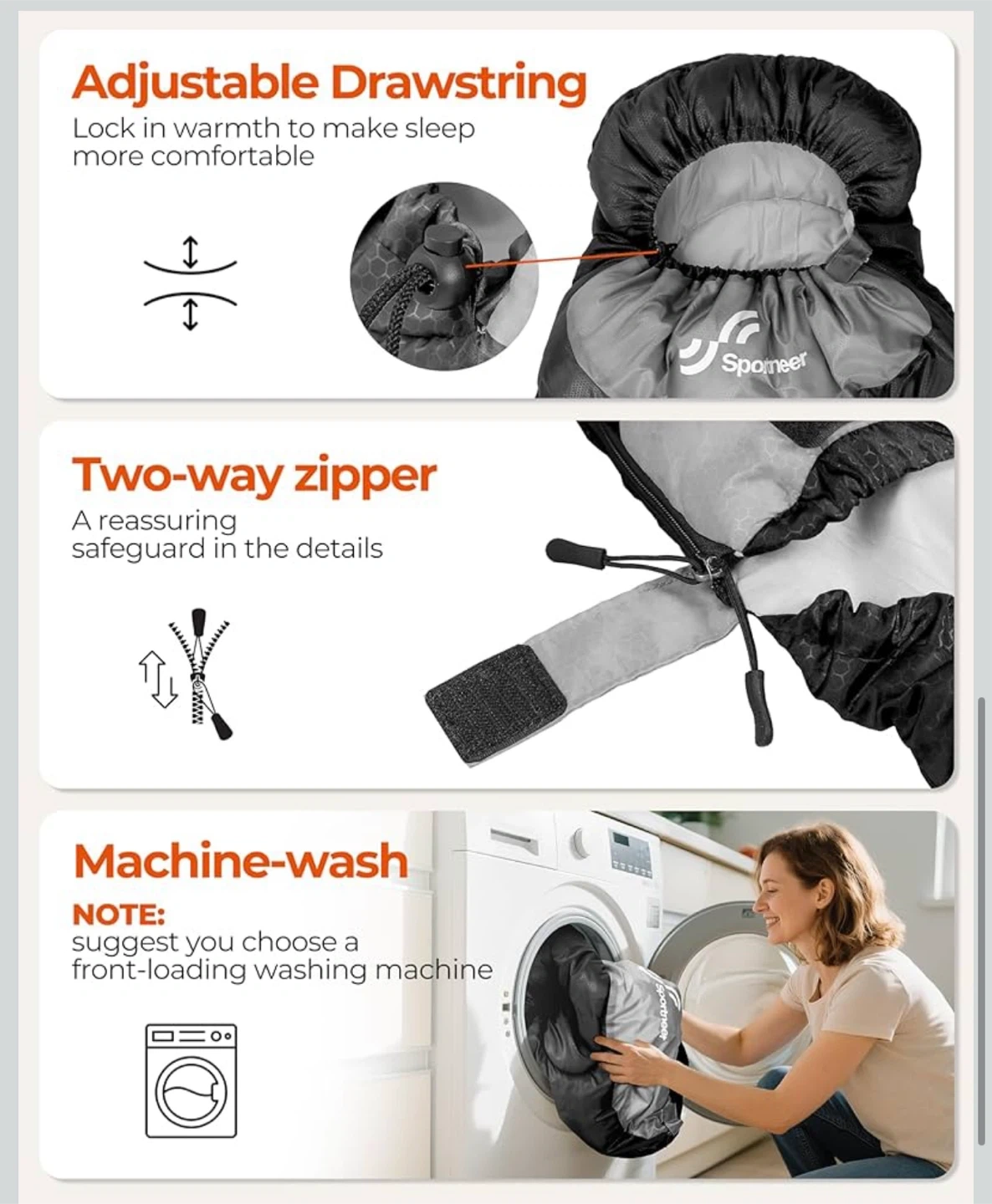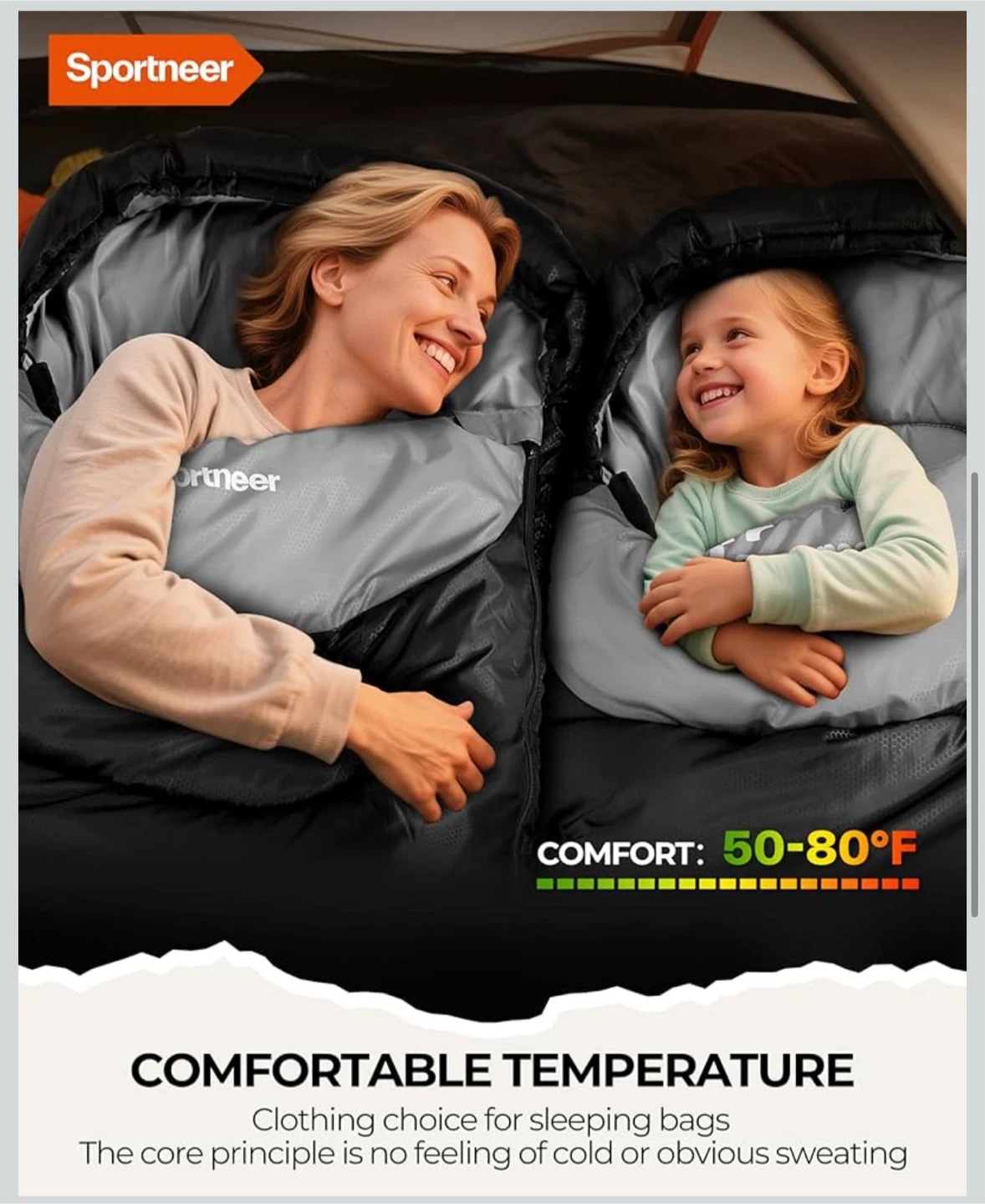 Get ready for camping with this Sportneer 3-Season Sleeping Bag! Designed for both adults and kids, it's perfect for spring, summer, and autumn adventures. It weighs only 3.3lbs (1.5kg) and folds down to a compact size of 9.4 x 13.8 inches (24 x 35 cm). Features include an adjustable drawstring and a two-way zipper. Plus, it's machine washable for easy cleaning Sleeping Bag, Sportneer Sleeping Bags for Adults Kids 3 Seasons Warm Cold Weather Waterproof Lightweight Camping Sleeping Bag for Adults Kids Boys Girls Teens Camping Hiking Backpacking Outdoor Travel Brand Sportneer Colour Black Occupancy 1 Person Seasons 3 Seasons Temperature rating 10 to 25 degrees Celsius Age range (description) Adult Suitable for 3-4 Seasons: Built from high quality polyester , the sleeping bag is the ideal option for camping as it can be the convenience needed for 3-4 seasons (spring, summer, fall and winter). Used for 3-4 seasons - comfort temperature is 50-80℉ (10-25°C), you can get the comfortable sleep you need after a day of adventurous outdoor camping, backpacking, hiking, outside travel. User-Friendly Design: For a more comfortable experience, we've created a two-way separating zip at the bottom to offer your feet some freedom. The semi-circular hood is designed with an adjustable drawstring which makes it easy to keep your head warm in the coldest climes. Proper Size: The camping sleeping bags for adults is the ideal sleeping bag for everyone. Measuring 31.5 x 87 inches, it can meet the needs of people of different heights and sizes. High-Quality Material: Crafted from premium materials (190T polyester taffeta outer layer + 190T polyester pongee inner lining + polyester filling), the compact sleeping bag for camping is superior to its competitors and can serve you for a very long time. Lightweight & Portable: The convenience doesn't stop when you sleep. It goes on even when it comes to storage and carrying. The warm season adult sleeping bag can go anywhere with you all thanks to its ultra-portability. You can have a happy hike with the sleeping bags for adults stored in its carry bag.