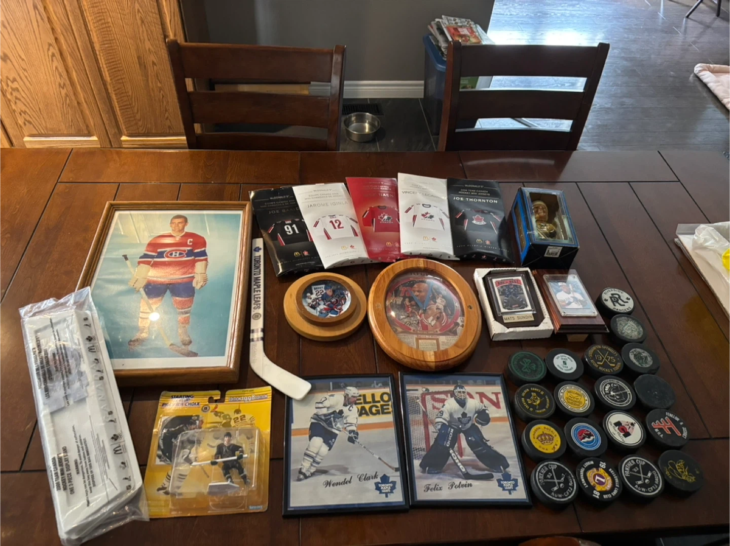 Selling a collection of hockey memorabilia. Includes items such as McDonald's 2006 Team Canada mini jerseys of players like Joe Thornton, Jarome Iginla, and Joe Sakic, as well as vintage hockey patches and pucks. A great collection for any hockey fan!