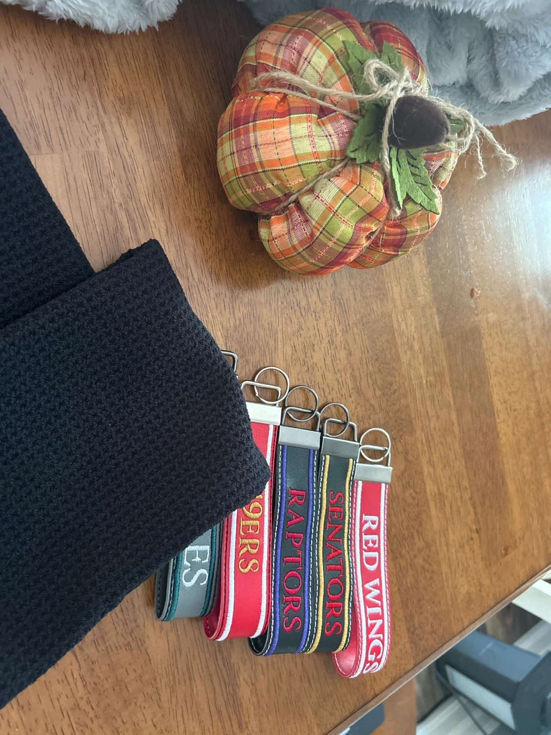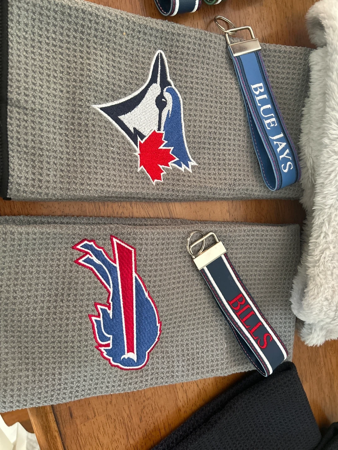Got some fun sports team items up for grabs! - Keychains for teams like the Blue Jays, Raptors, Senators, Red Wings, Eagles, Dolphins, Bruins, Packers, and Bills - Towels featuring the Blue Jays and Bills logos Blankets - grey, royal and red available-$75 - MADE TO ORDER Golf towels —Bills, Jays or custom -$30 (grey. Black, navy and available) Some immediately available Keychains $10 each - many ready to go., some made to order. Hoodies/crew necks $55-75- dependent on size)