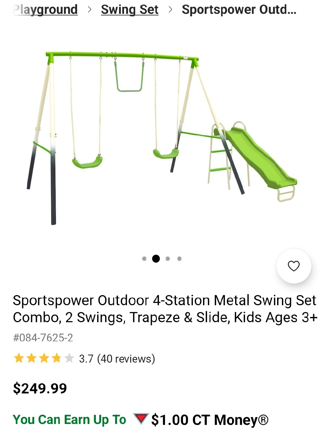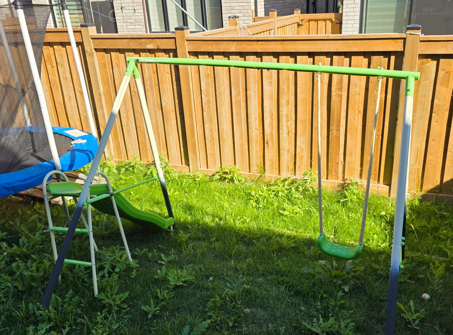 I'm selling a Sportspower Outdoor 4-Station Metal Swing Set Combo, perfect for kids ages 3+. It includes 2 swings, a trapeze, and a slide. Originally bought for $249.99 Not even fully Assembled yet Hardly used accessories and Box Available