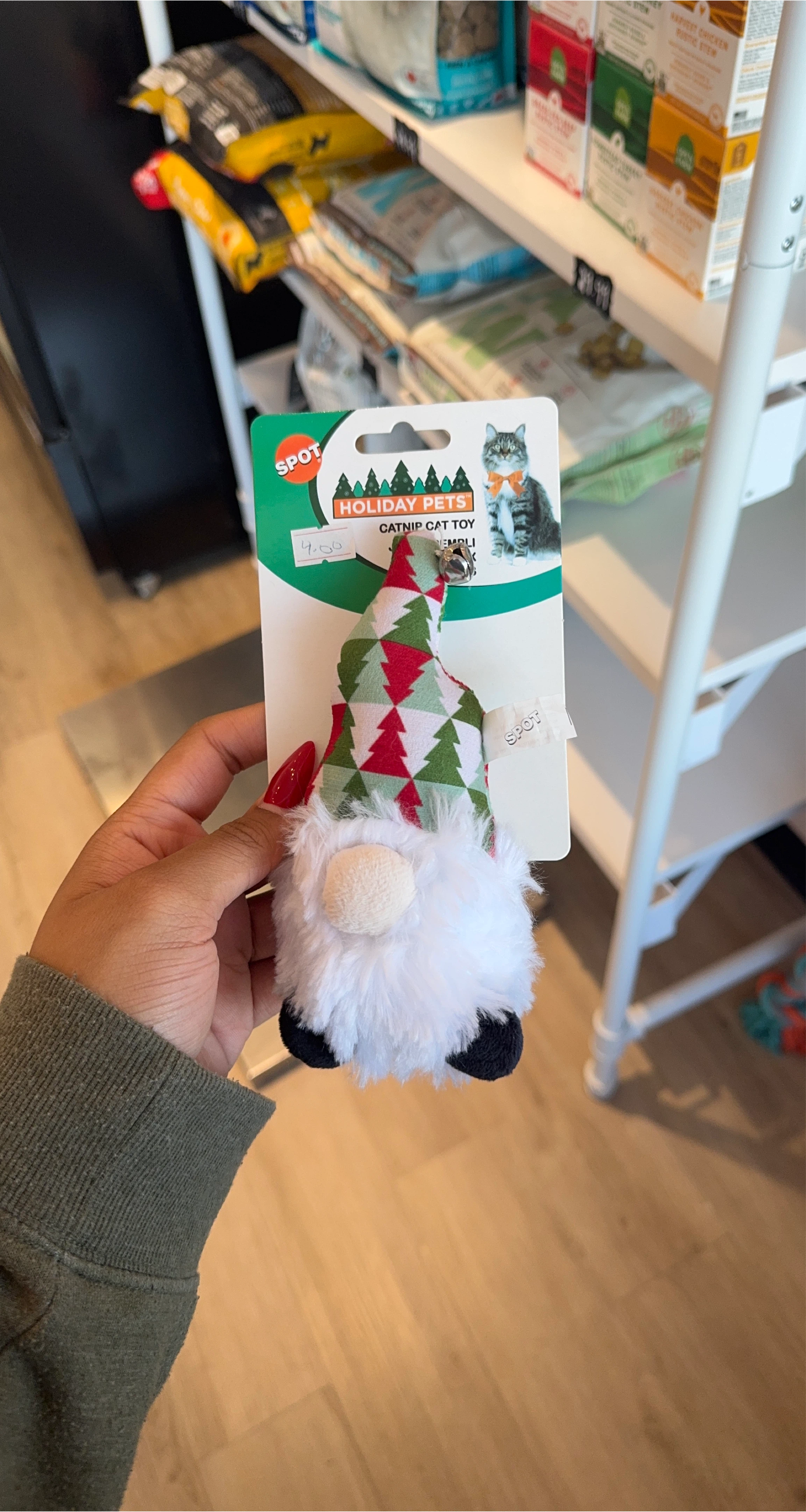 This is a SPOT Holiday Pets catnip cat toy in the shape of a gnome! It's a cute and festive toy for your feline friend. The tag shows it was originally $4.00