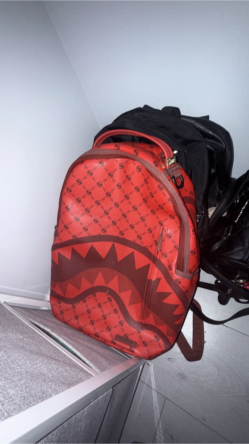 Selling a red Sprayground backpack with a unique shark design! It features a cool pattern of dollar signs and the iconic shark mouth. Perfect for adding some style to your everyday carry