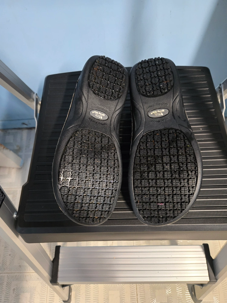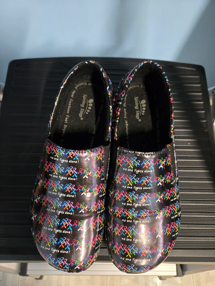 I'm selling a pair of Spring Step clogs with a unique "No One Fights Alone" design! These slip-resistant shoes are perfect for work or everyday wear. They feature a comfortable, cushioned insole and a durable, easy-to-clean upper. The soles are designed for excellent traction on slippery surfaces. Very comfortable but unfortunately too small for me. Size 7 women's.