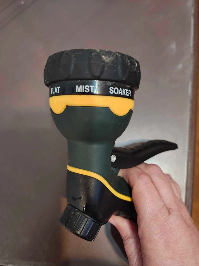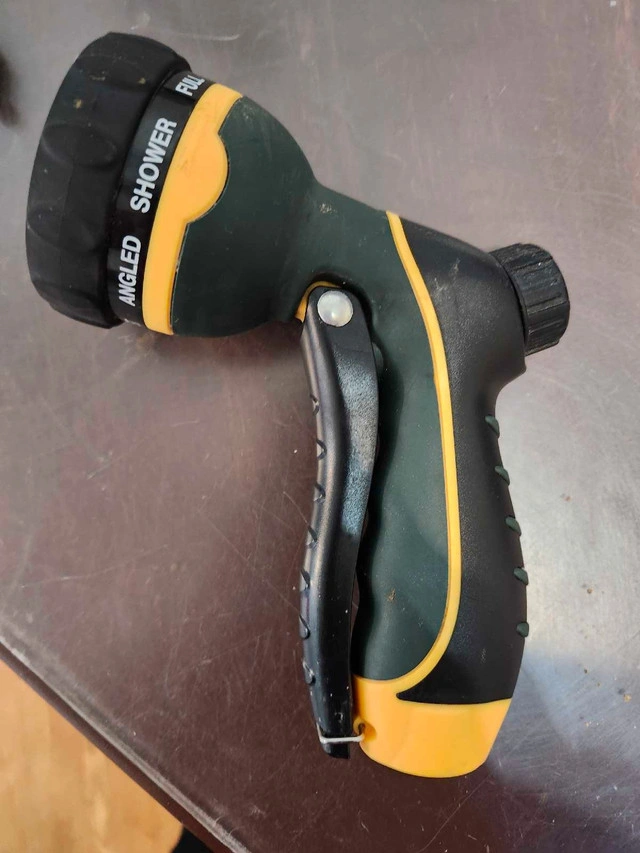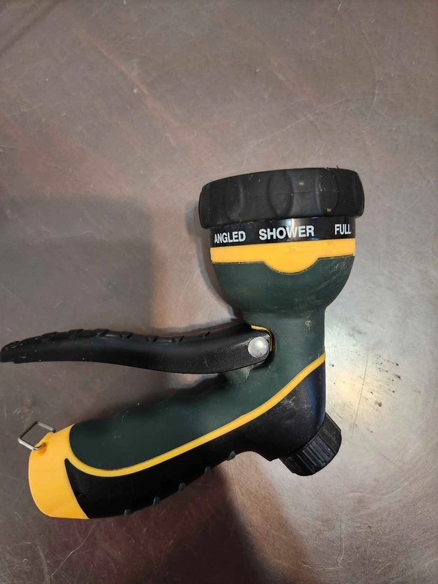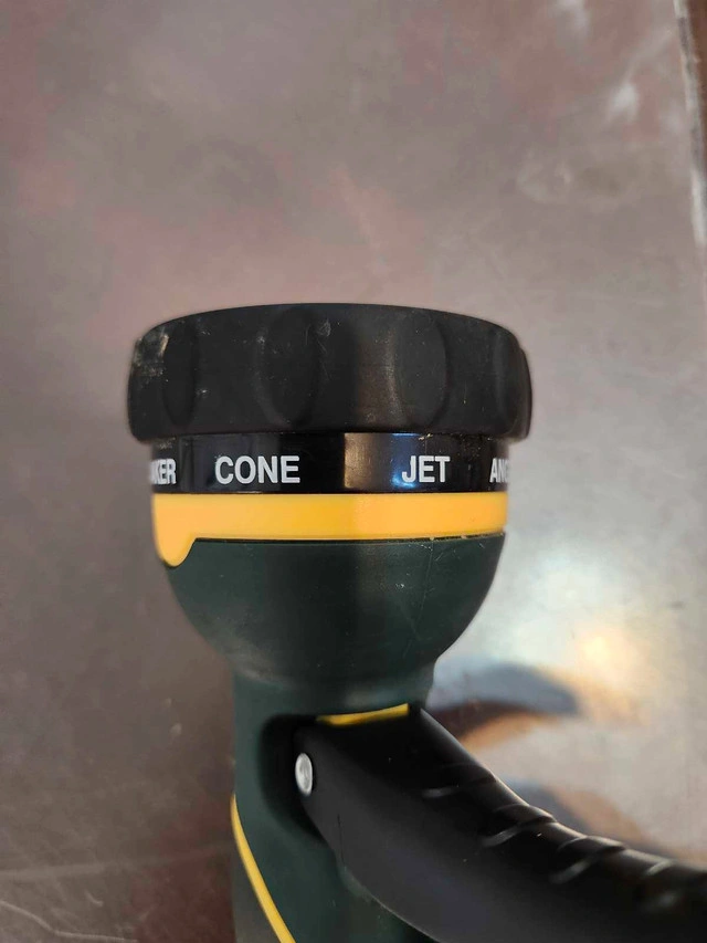 This is a used multi-pattern Gilmour sprinkler nozzle, perfect for all your gardening needs! It's got 8 different spray patterns to choose from: Angled, Shower, Full, Cone, Jet, Flat, Mist, and Soaker. Let me know if you're interested!