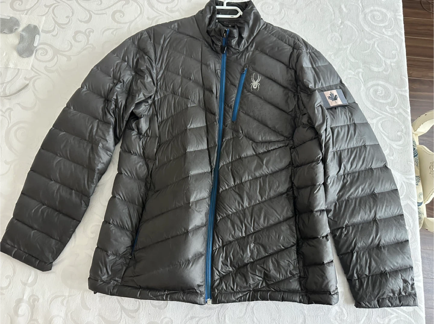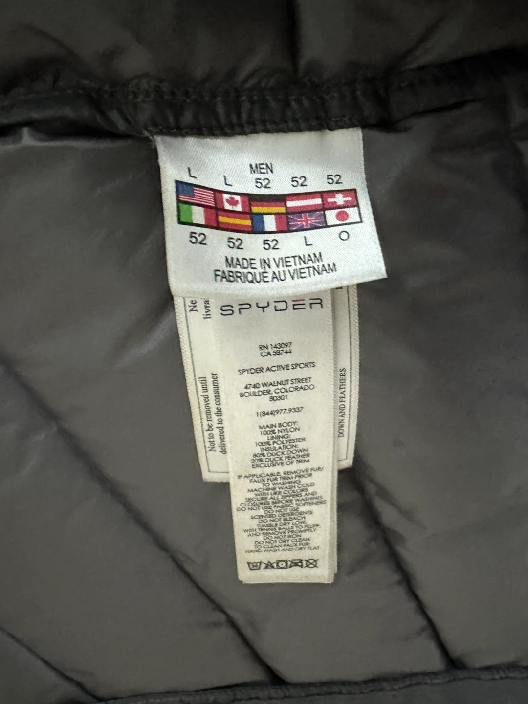 Selling a Spyder Active Sports puffer jacket in size L. It's made in Vietnam with a main body of 100% nylon and lining of 100% polyester. The insulation is 80% duck down and 20% duck feather exclusive of trim. Perfect for staying warm!