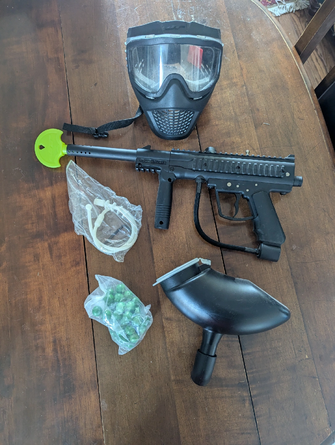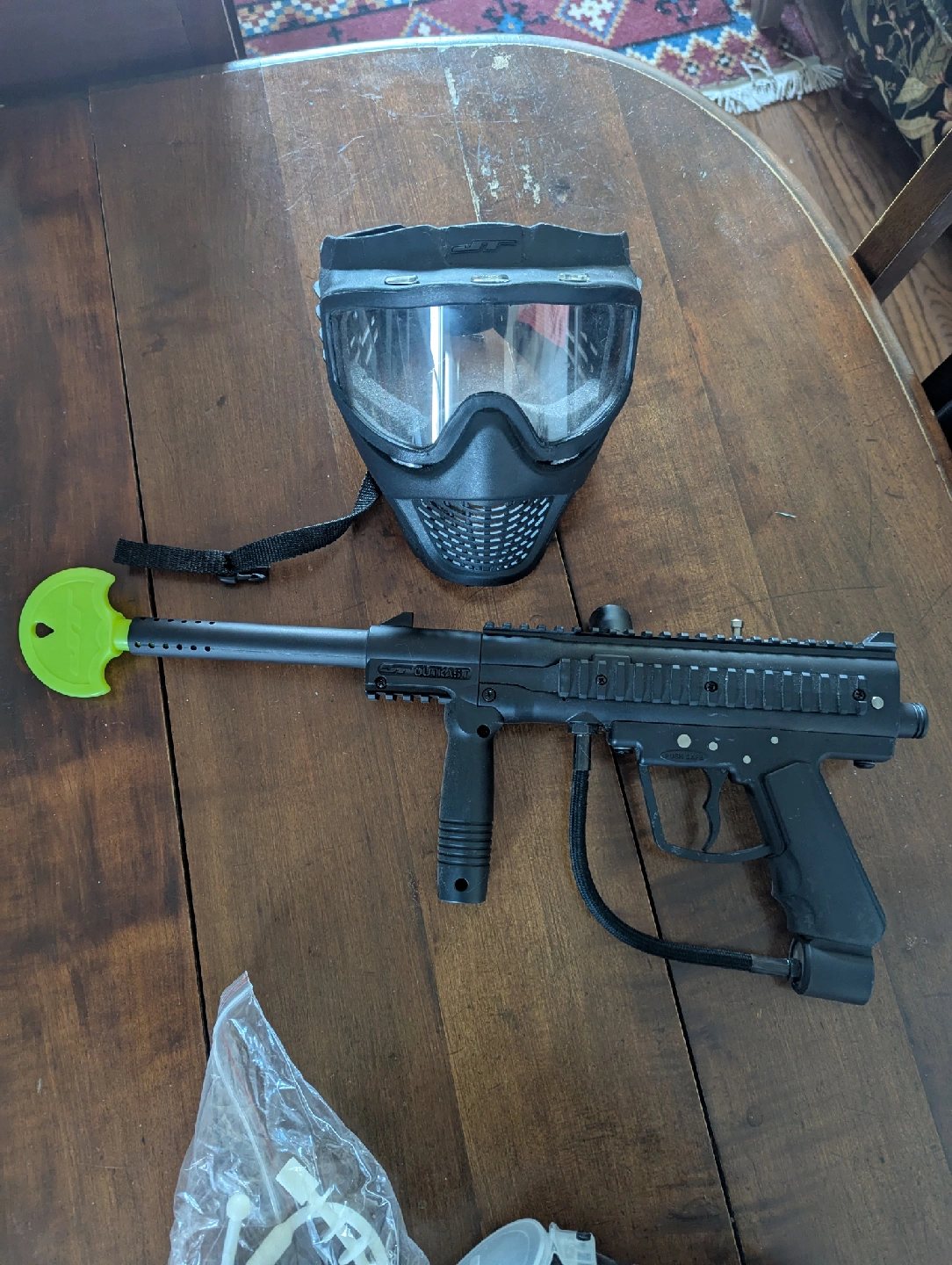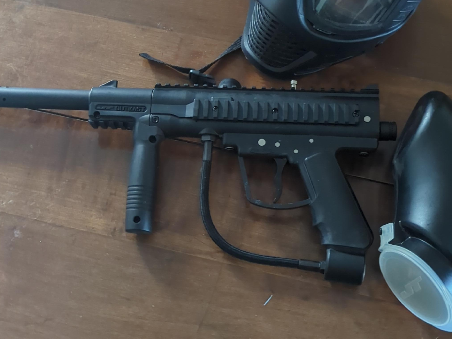 Selling a JT Outkast paintball gun starter kit. It comes with a mask, hopper, barrel plug, and some paintballs to get you started. Ready for some outdoor fun! CO2 Tank not included. - 2 finger trigger gun - Great for new players -Never used