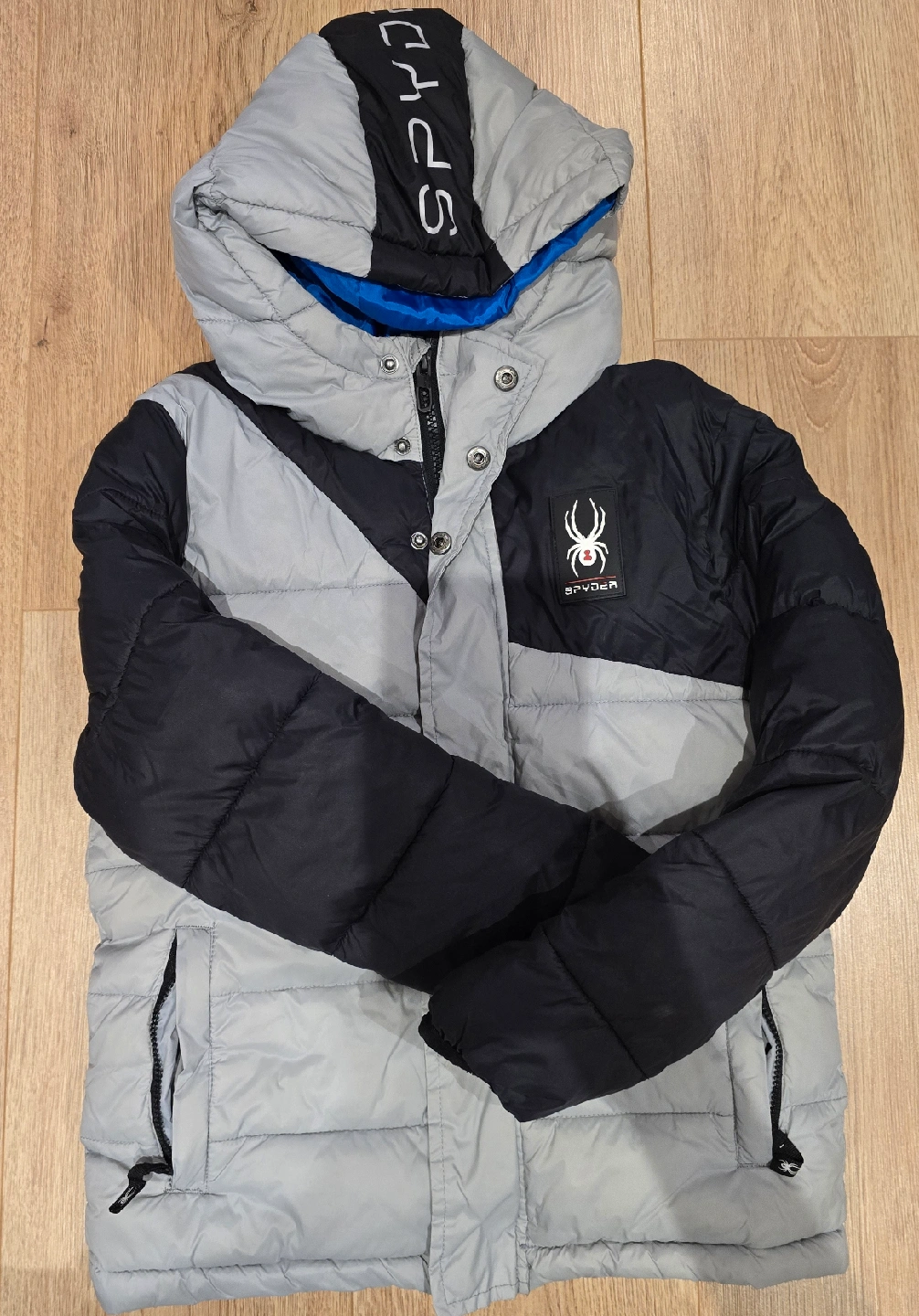 Selling a Spyder puffer jacket in size S (7/8). It's in great condition and perfect for keeping your little one warm during the colder months. The jacket features a stylish design with a black and grey colour scheme. It also has a hood for extra protection against the elements