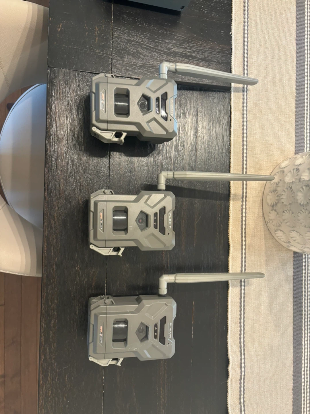 Selling a set of three SpyPoint Flex-M trail cameras. They are in good condition and ready to be set up for wildlife monitoring or security purposes. Each camera includes an antenna and uses a lithium battery pack. Comes with its own SIM card HD satellite photo transmission 2 metal camera holders used once