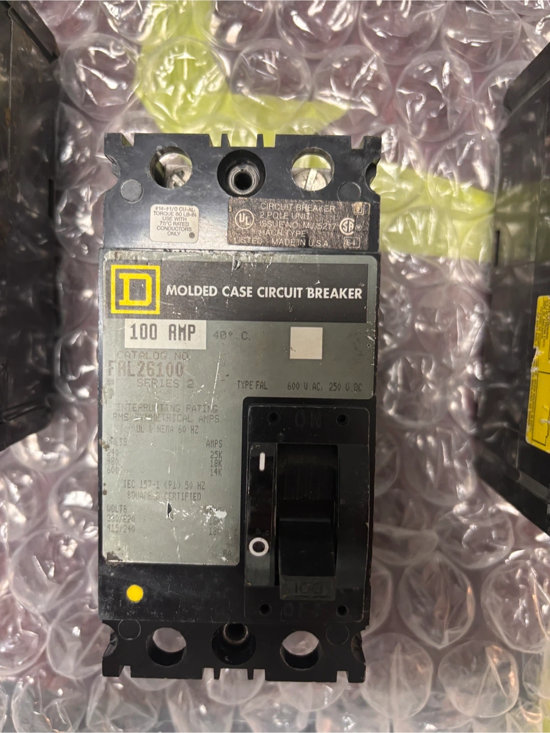 Selling 4 Square D molded case circuit breakers. They are rated for 100 AMP. Catalog number FRL26100, Series 2. They are each over $1000 brand new or about $750 reconditioned. To be clear the listing here is $500 for each breaker.