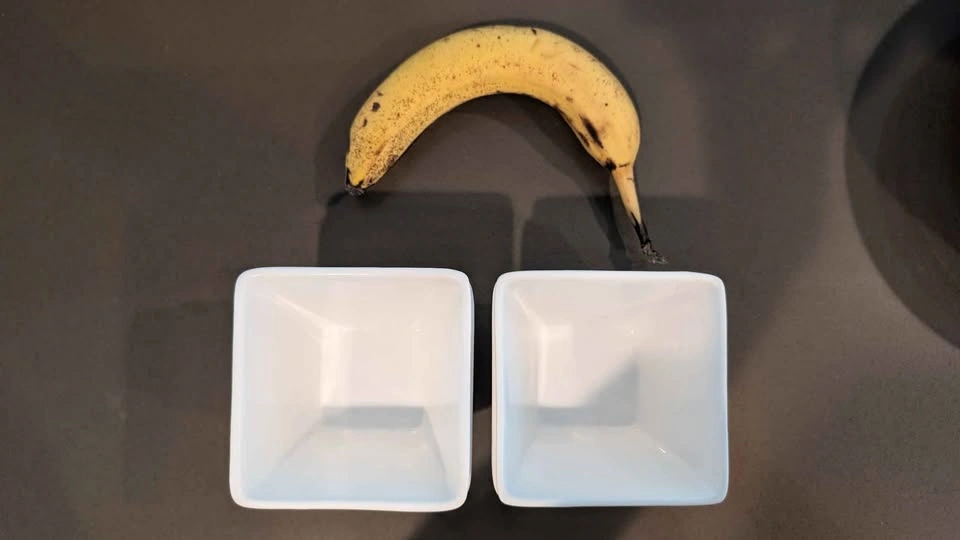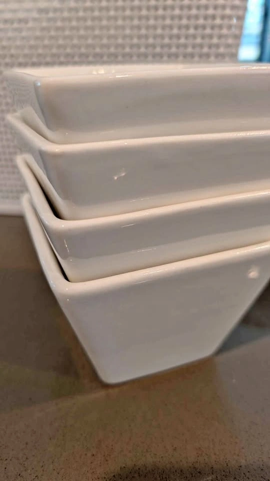 4 square serving bowls. Great for small snacks. Banana for size comparison.