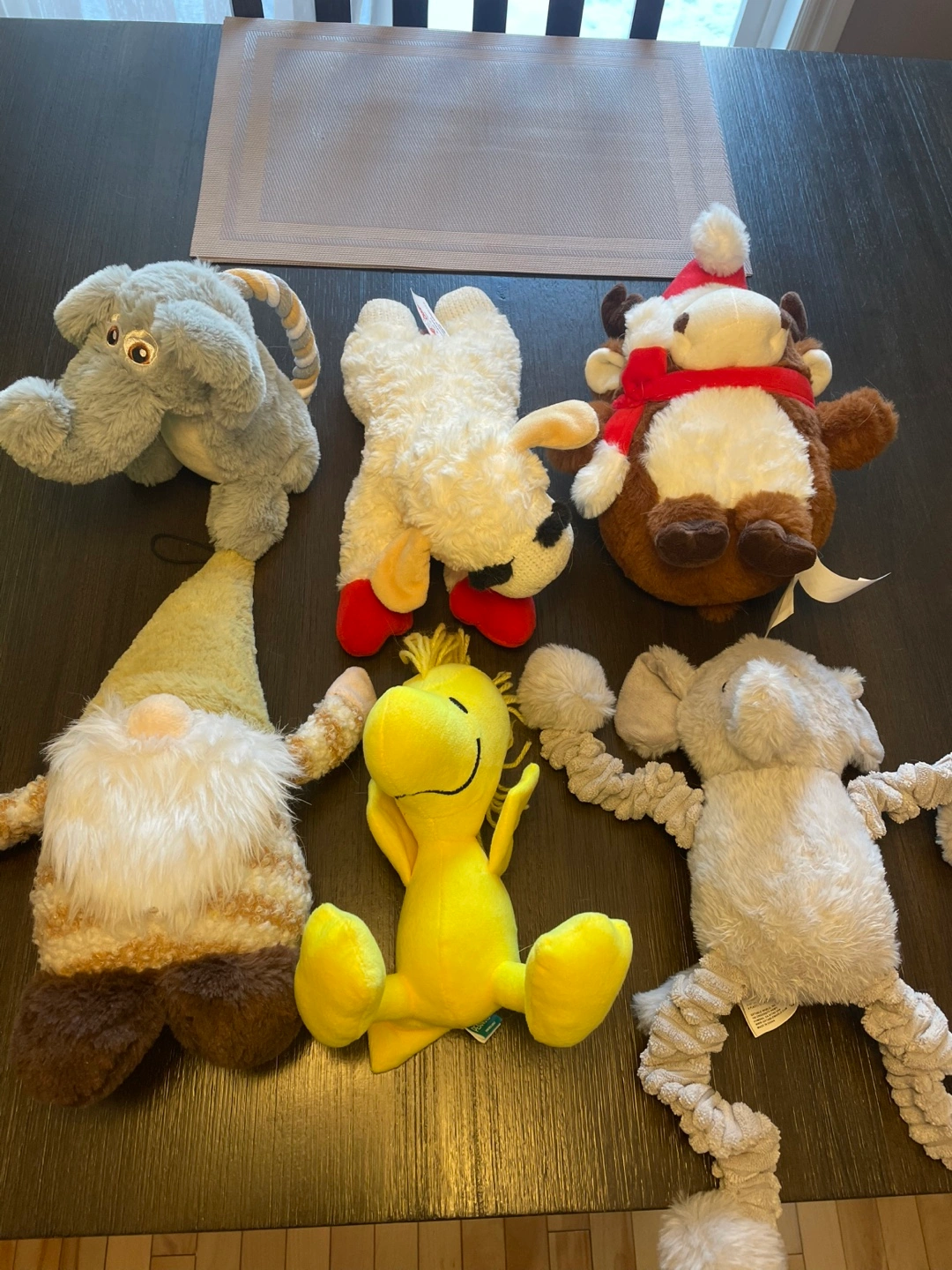 Six plush dog toys. Includes elephant, lamb, bull, gnome, and Woodstock, all squeak and in perfect condition.