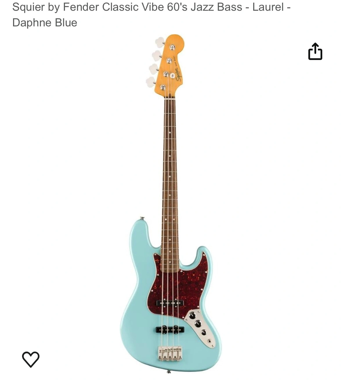 Squier by Fender Classic Vibe 60's Jazz Bass - Daphne Blue + a Fender gig bag Set It has been kept in good condition. No major flaws or damage to the guitar. Please feel free to ask any questions you may have.