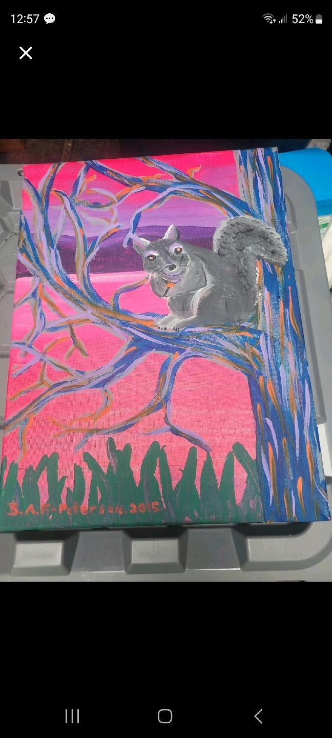 willing to give free when purchasing any of my other items Selling a unique painting of a squirrel perched in a tree against a vibrant pink and purple sky. The painting is signed B.A.F. Peterson, 2015. It's a charming piece that would add a touch of whimsy to any room