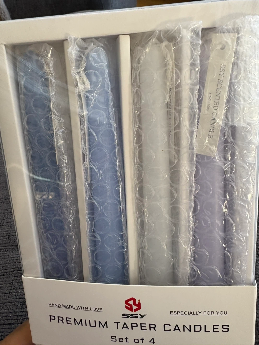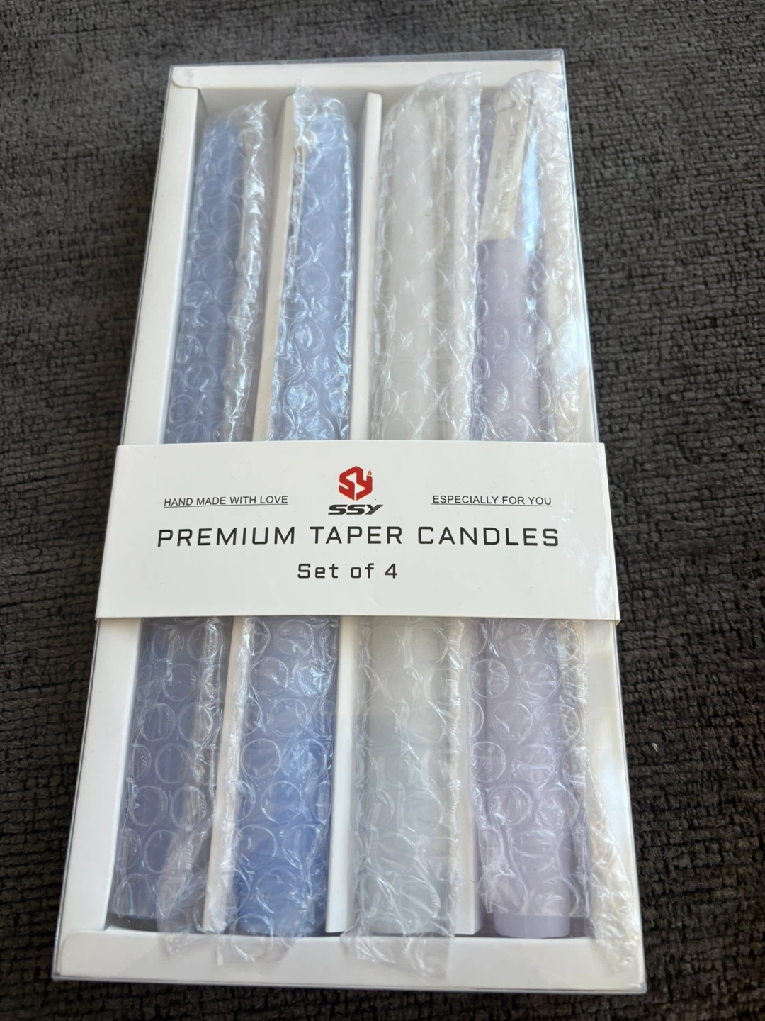 Selling a brand new set of 4 SSY Premium Taper Candles! These are hand made with love and come in a beautiful set of 4. The candles are in various shades of blue and white, perfect for adding a touch of elegance to any room. Comes in original packaging!
