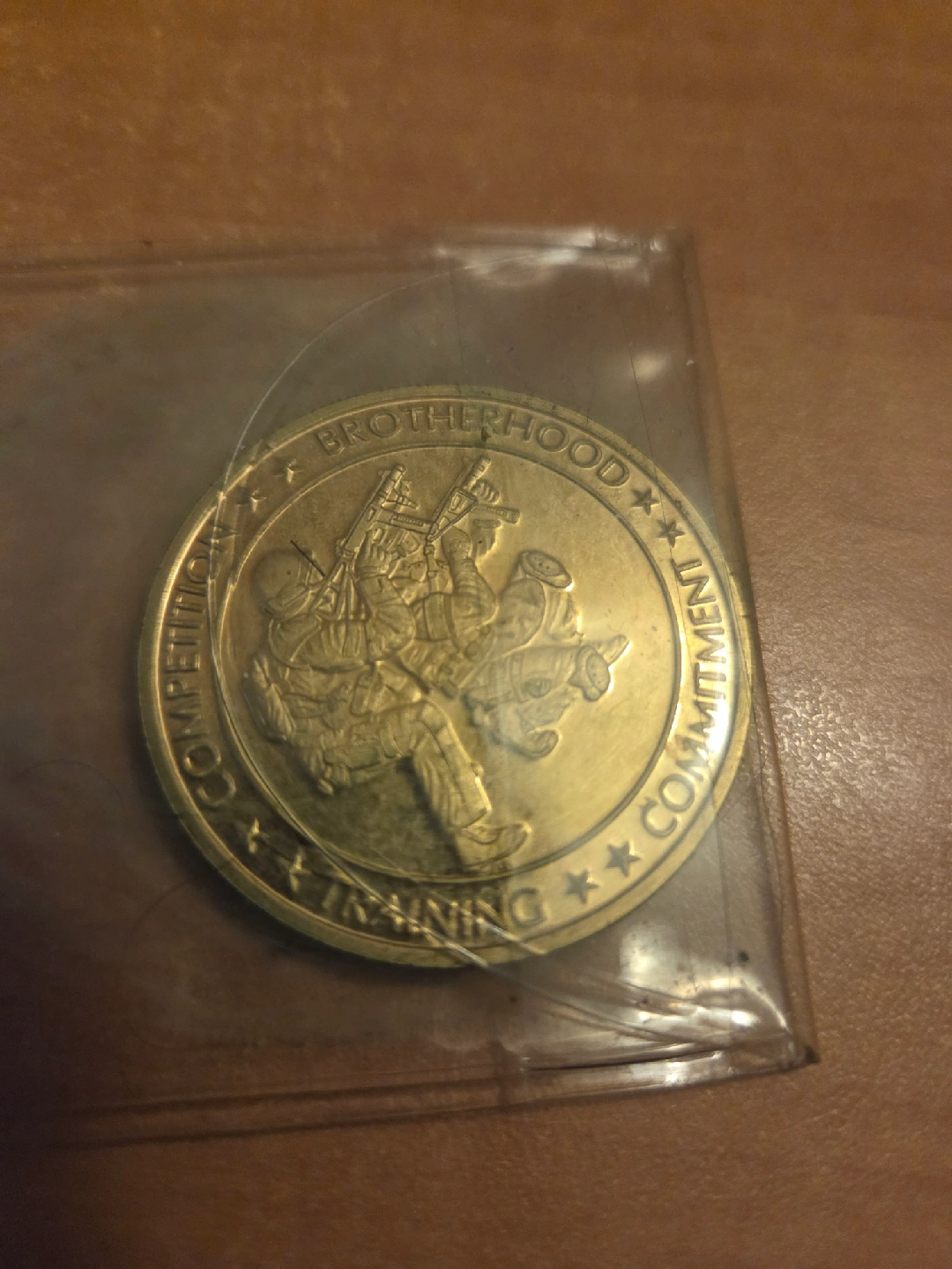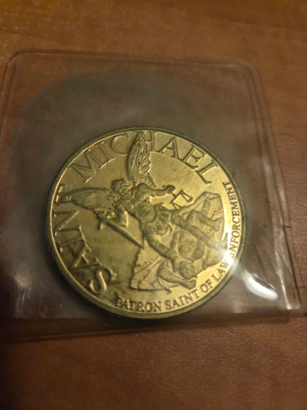 Brand new St. Michael the Archangel challenge coin in a protective plastic case.