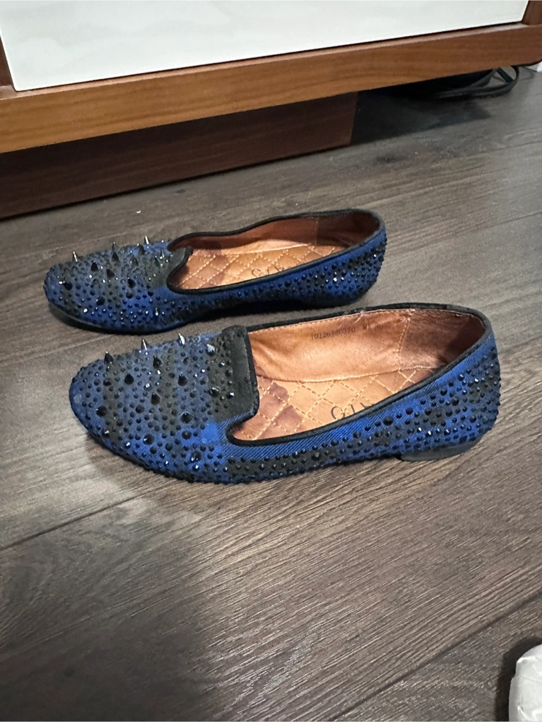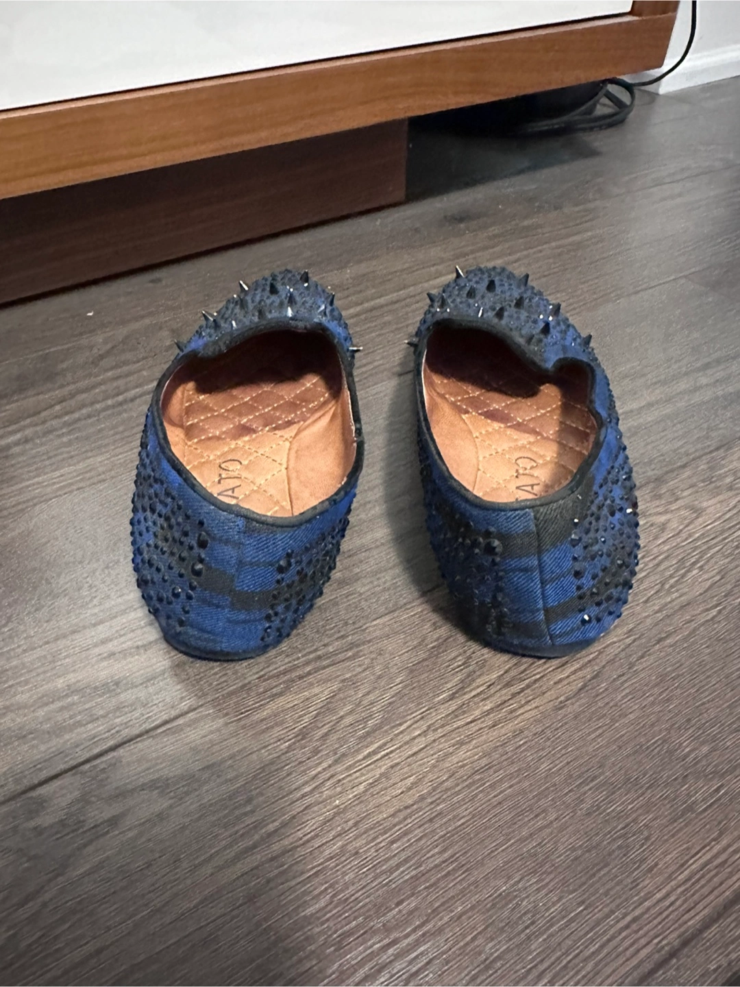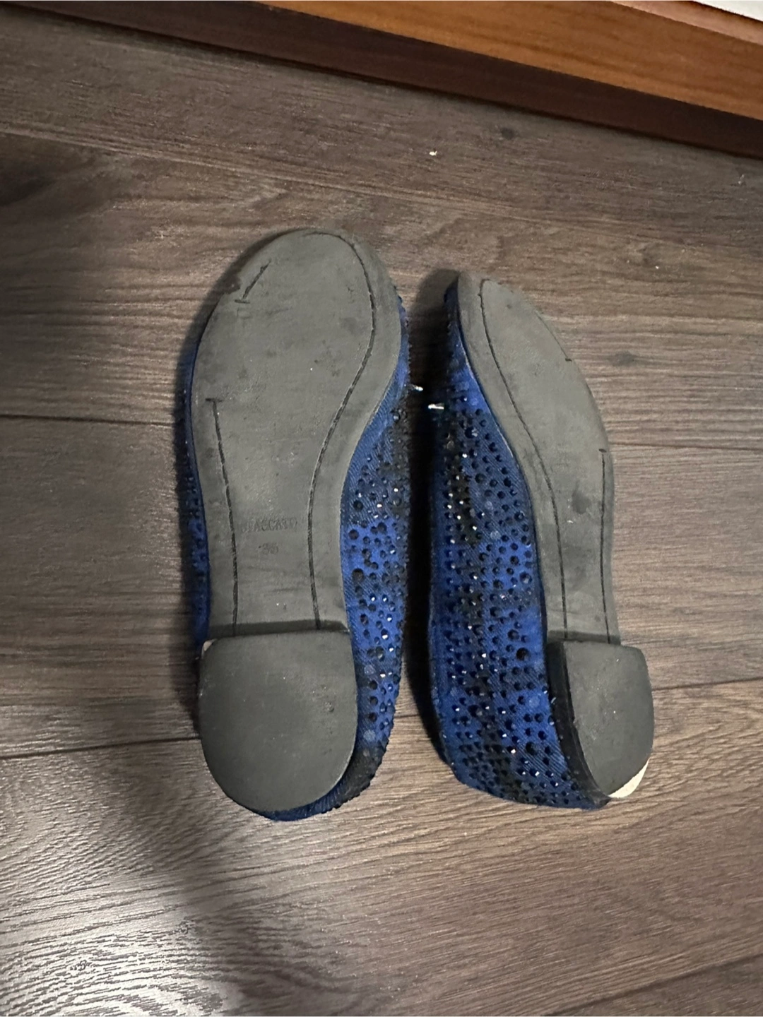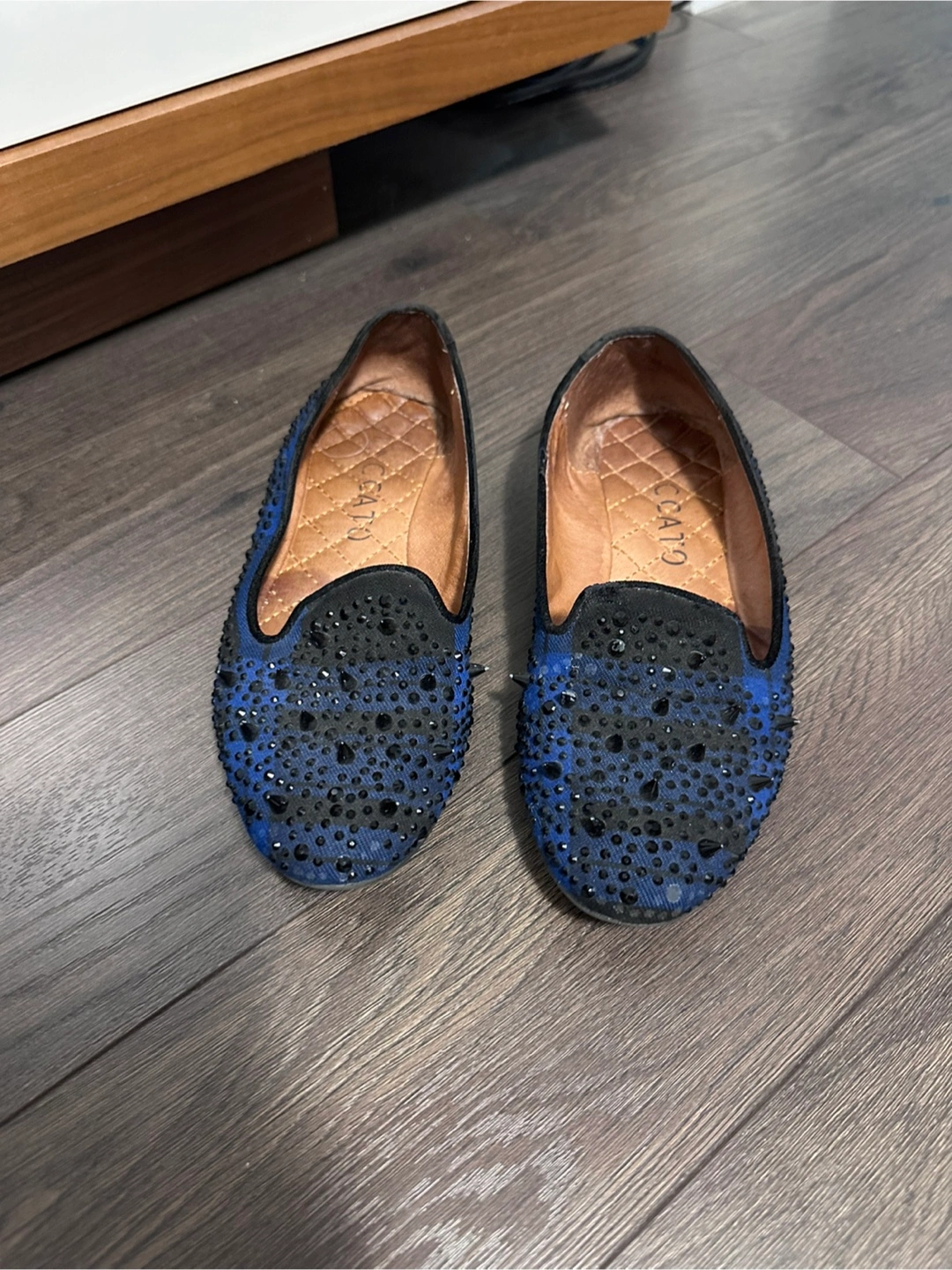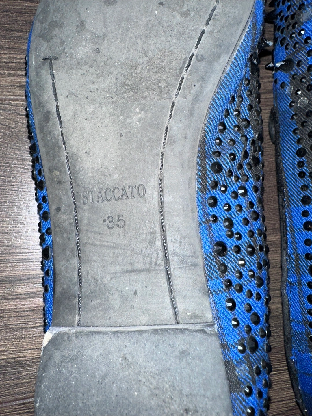 Selling a pair of Staccato slip-on flats in blue and with black embellishments. They are in used condition, as shown in the photos. Size 35.