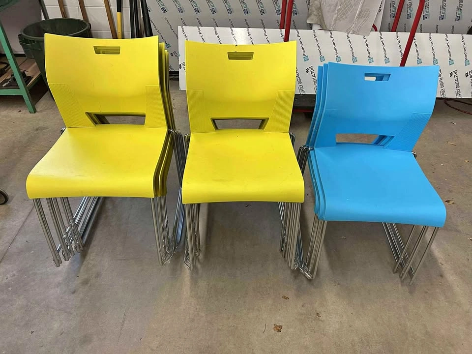 In very good condition. Seats measure approximately 18” wide x 19” deep. Back height is approximately 33” from the floor. Seat back is approximately 16” from the top of the seat. 20 available, 16 yellow, 4 blue. $60 each plus HST. Pick up near Conestoga Mall in Waterloo, Monday to Friday from 12-5.
