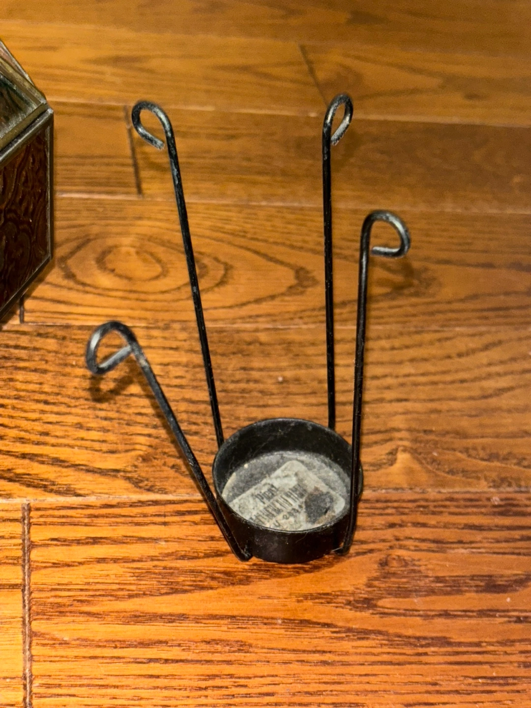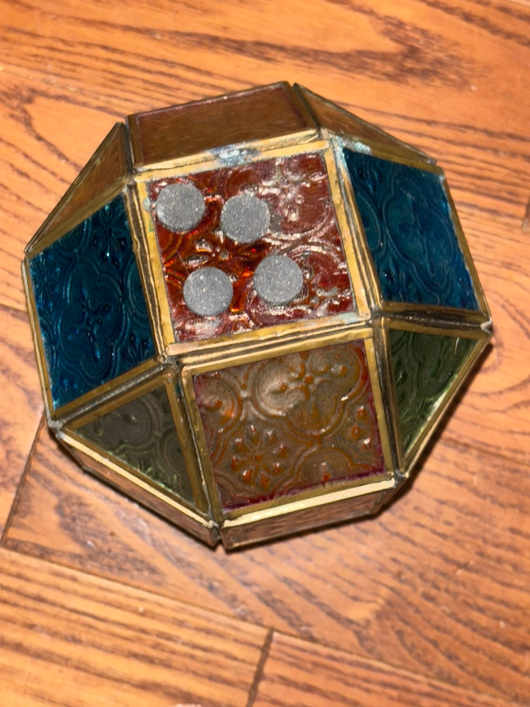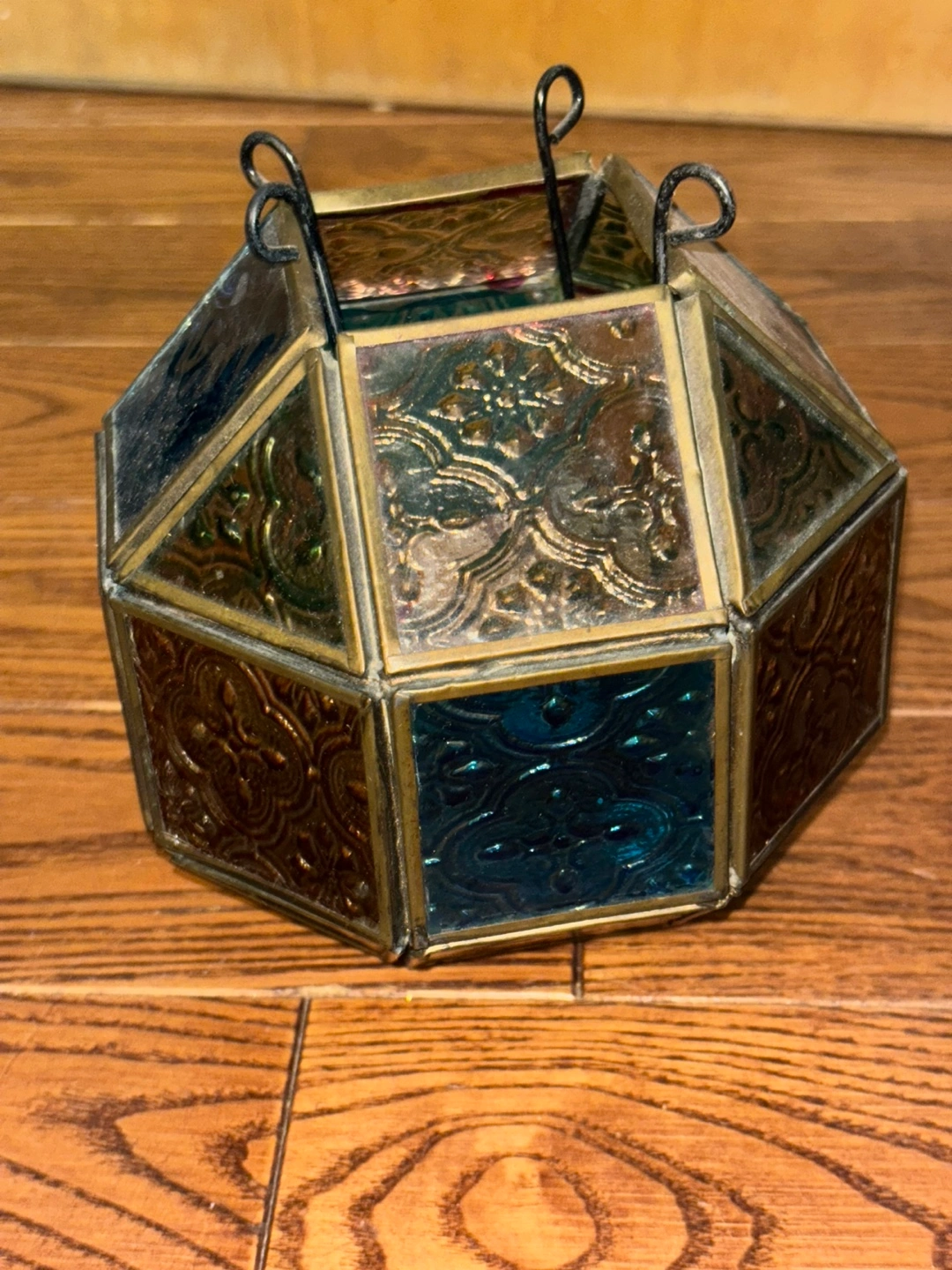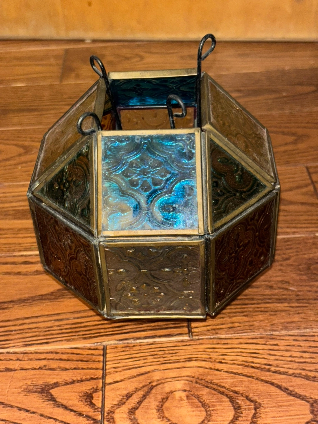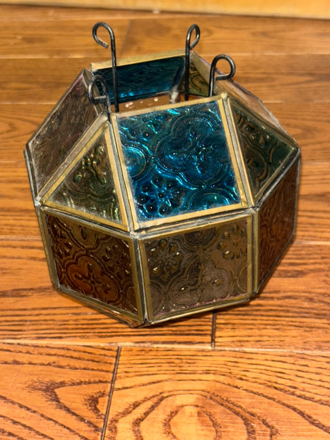 Selling a unique stained glass candle holder. It has a beautiful mix of blue, brown, and gold coloured glass. It would look great in any room!