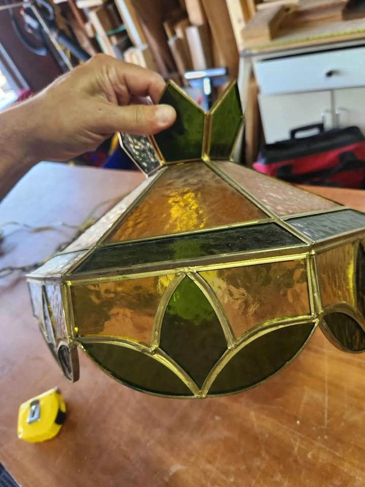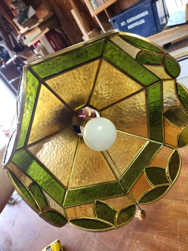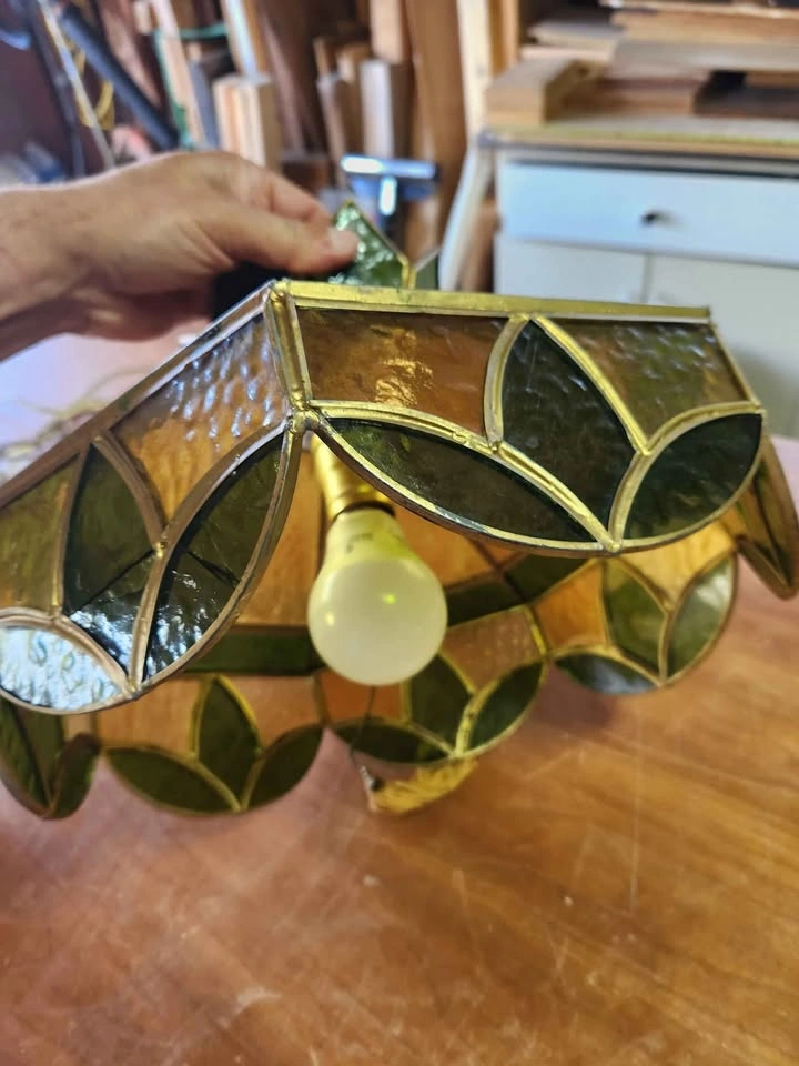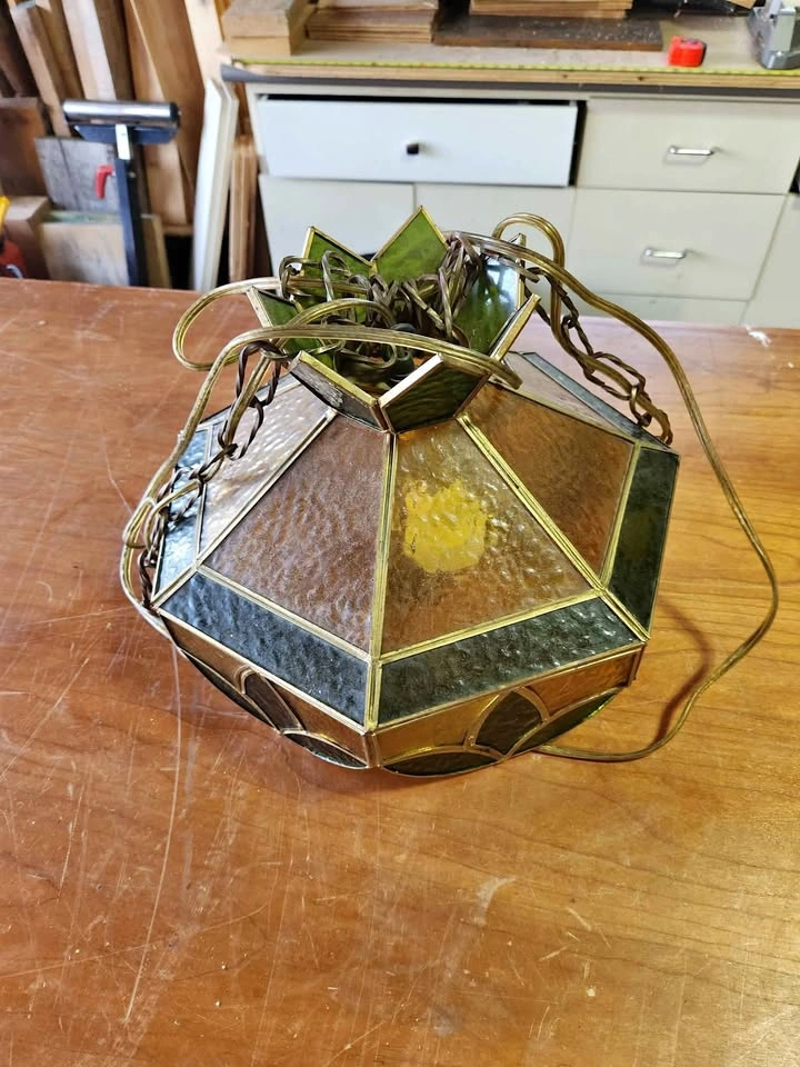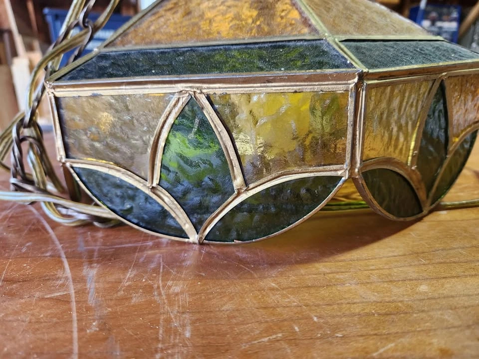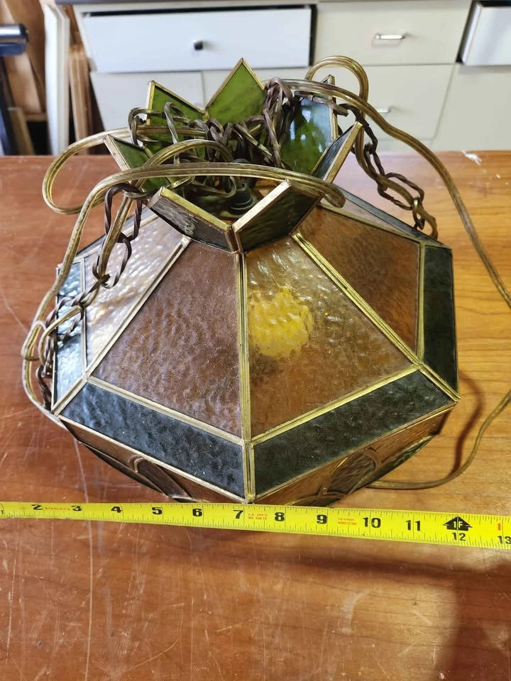 Stained glass chandelier measures 12 in across. Single light bulb with long chain and long wire. Best offer pickup and beansville