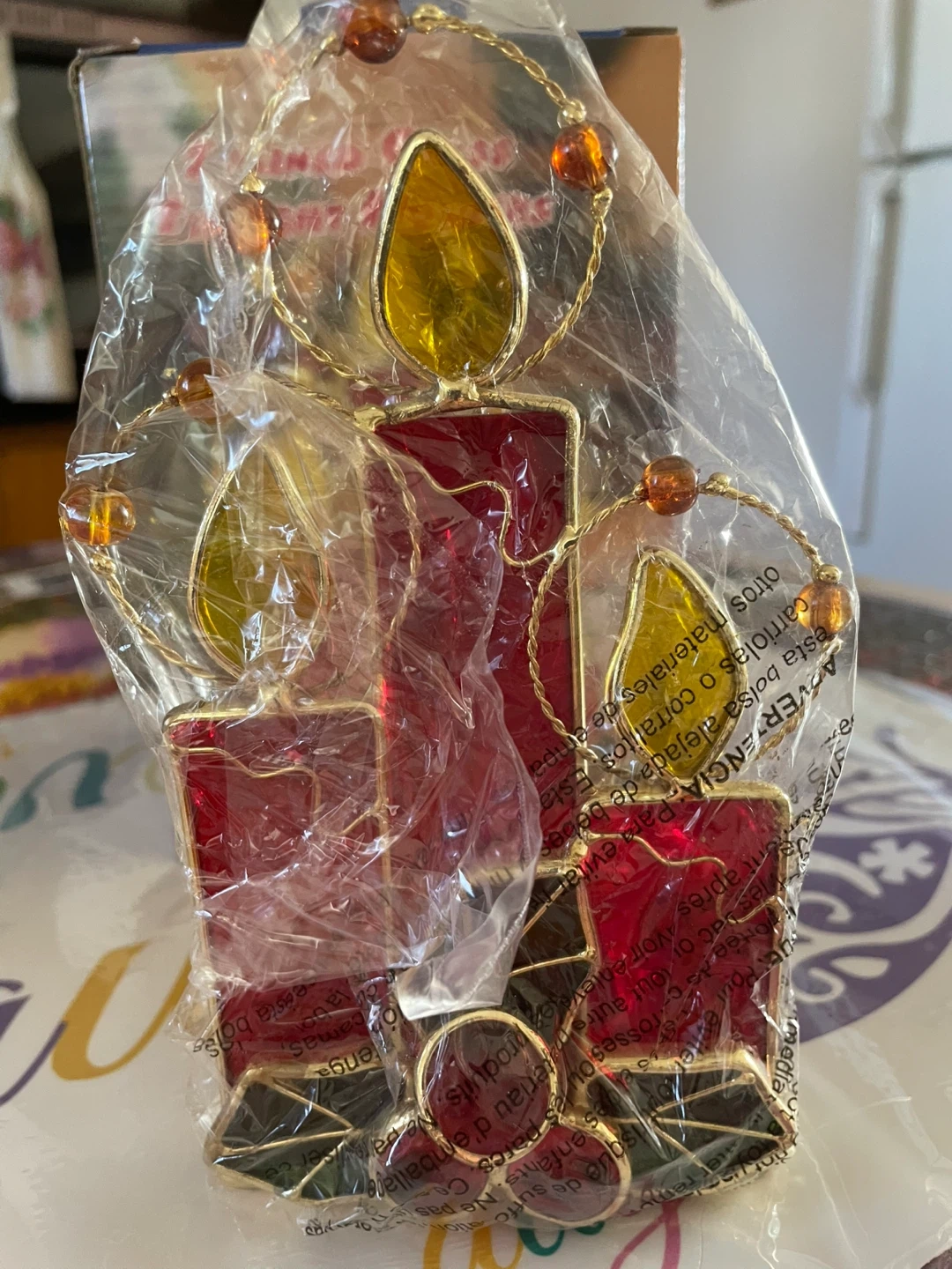 Selling a brand new stained glass tealight candle holder! It features a beautiful design with red and yellow candles, accented with gold trim and amber-coloured beads. Perfect for adding a touch of warmth to any room