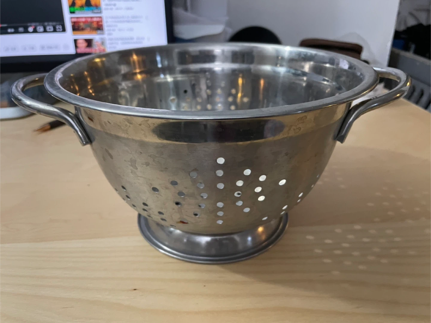 Selling a stainless steel colander. It's in great shape and ready for a new home. Perfect for rinsing fruits, veggies, or draining pasta. It has a sturdy base and comfortable handles for easy use