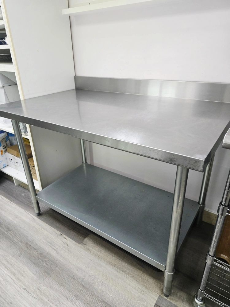 Selling a stainless steel commercial work table. It's in good condition and perfect for a kitchen or workshop. It features a sturdy construction with a lower shelf for extra storage