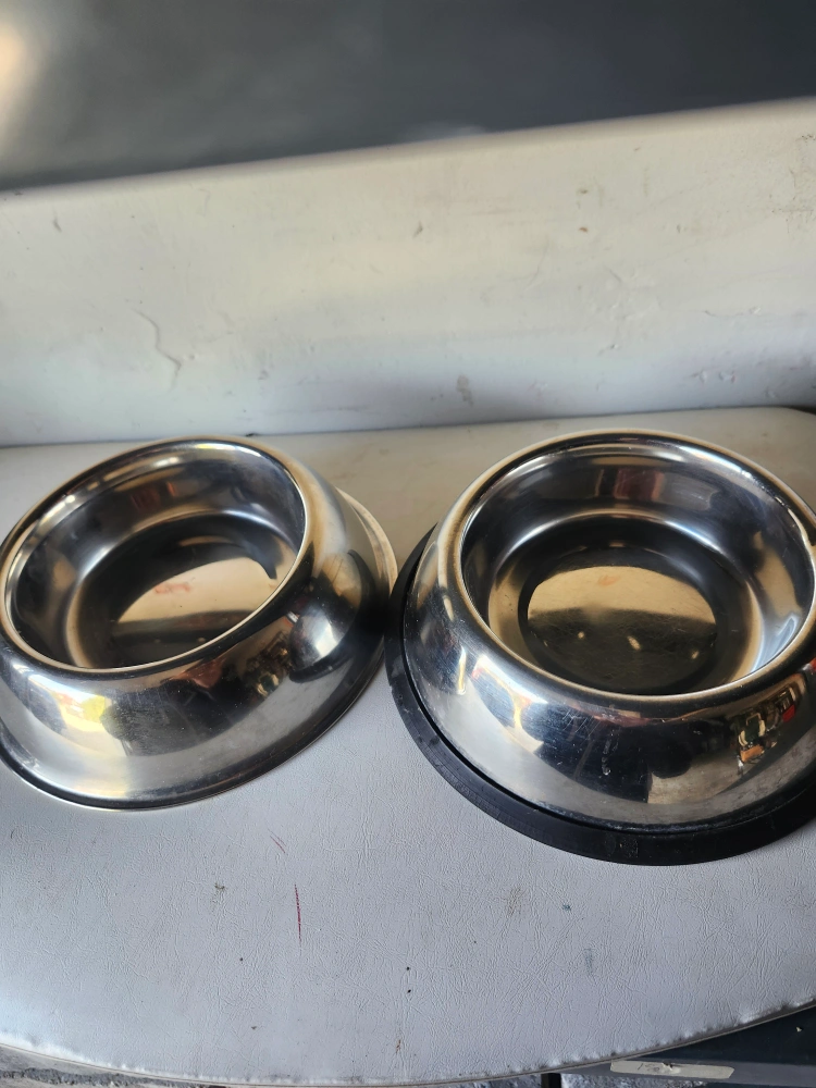 Selling a set of two stainless steel dog bowls. They're in great shape and ready for a new furry friend! Perfect for food or water, these bowls are durable and easy to clean ● BOTH BOWLS 7.00 ●