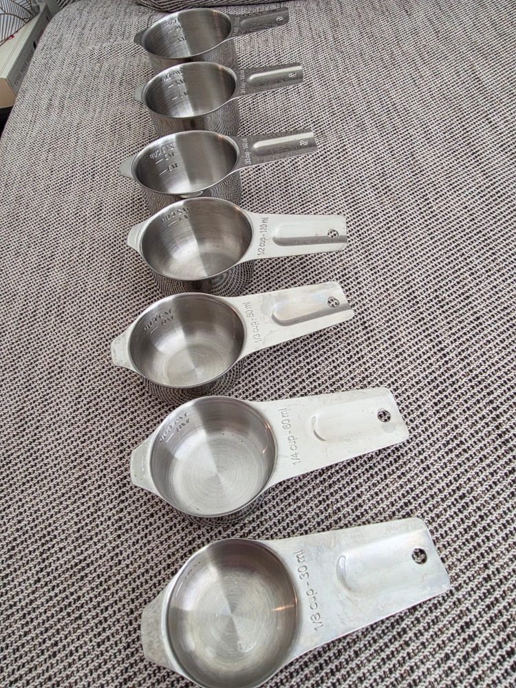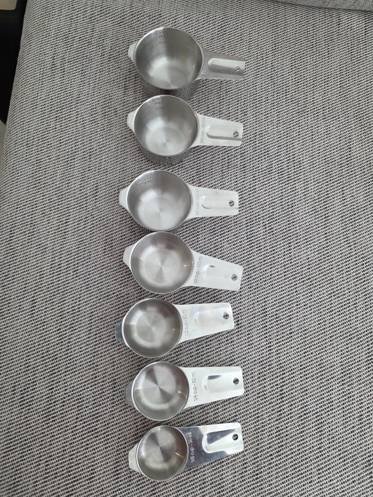 Selling a set of 7 stainless steel U-taste measuring cups. This set includes: - 1 cup - 240 ml - 3/4 cup - 180 ml - 2/3 cup - 160 ml - 1/2 cup - 120 ml - 1/3 cup - 80 ml - 1/4 cup - 60 ml - 1/8 cup - 30 ml