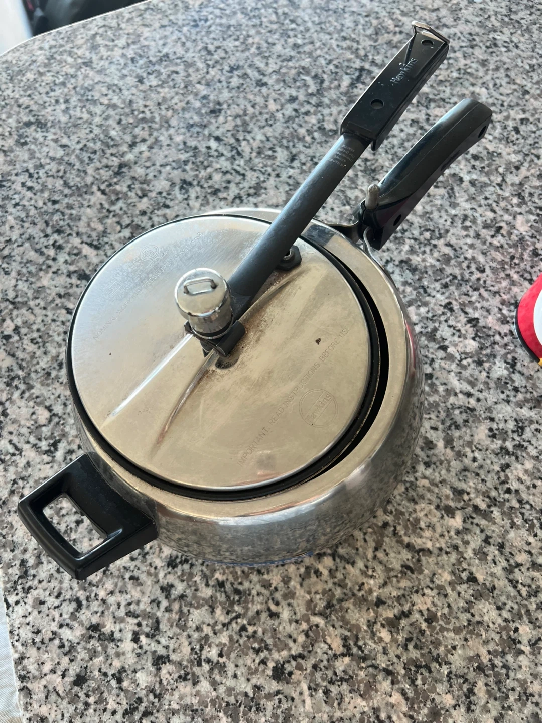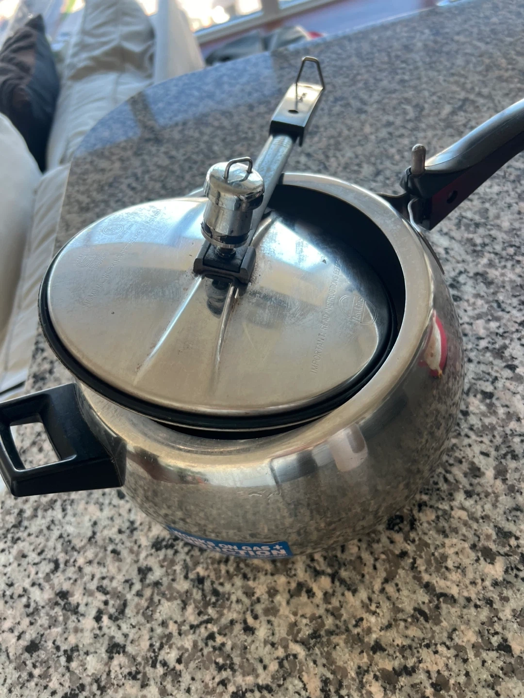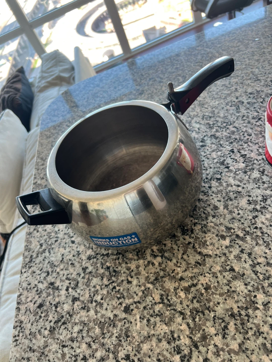 Selling a stainless steel pressure cooker. It has black handles and a silver finish. It is compatible with gas and induction cooktops. Good condition!