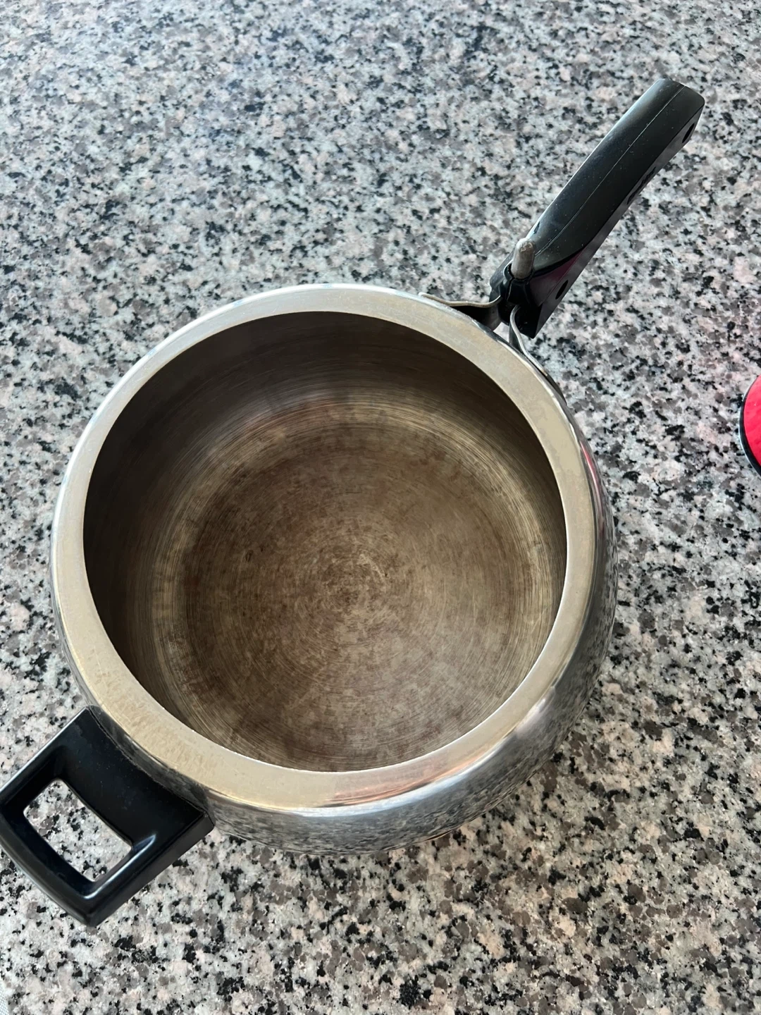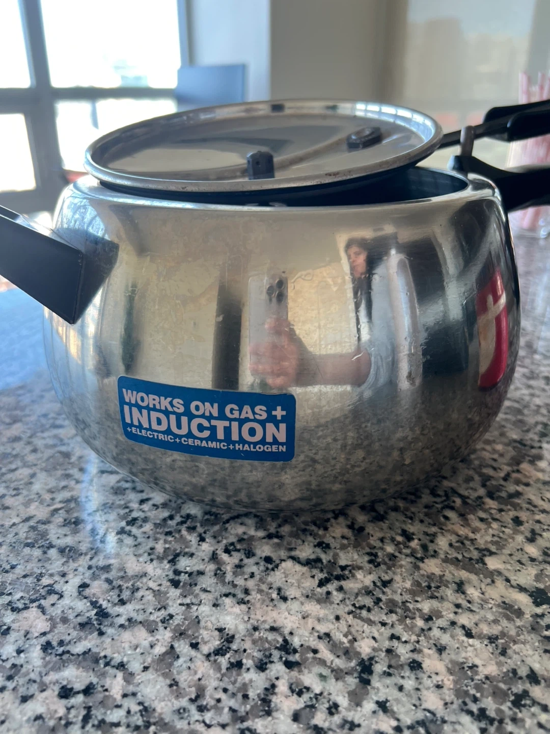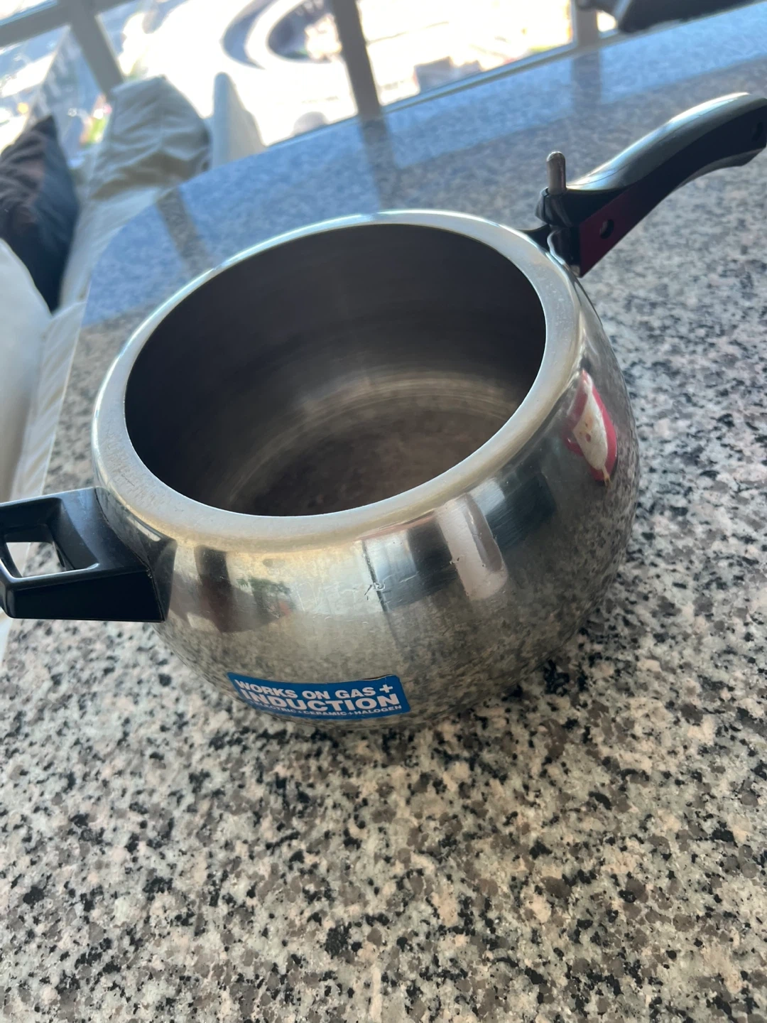 Selling a stainless steel pressure cooker. It has black handles and a silver finish. It is compatible with gas and induction cooktops. Good condition!