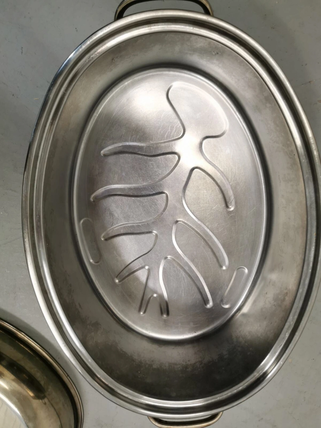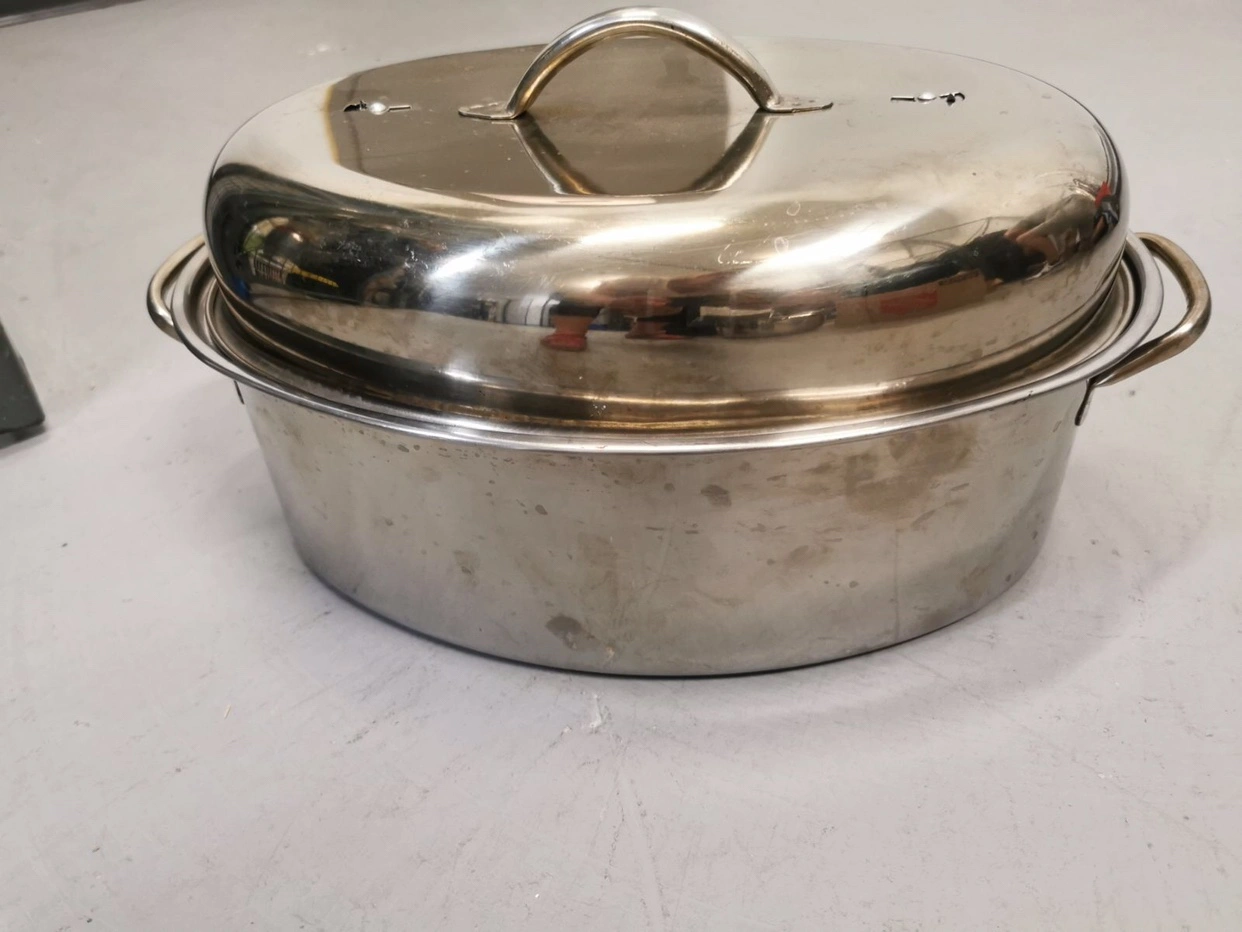 Large stainless steel roasting pan with a lid and a leaf design on the bottom. Good for roasting, baking, or serving. It has two handles on the sides and one on the lid.