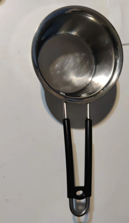Selling a stainless steel saucepan with a black handle. It's in good used condition and ready for a new home