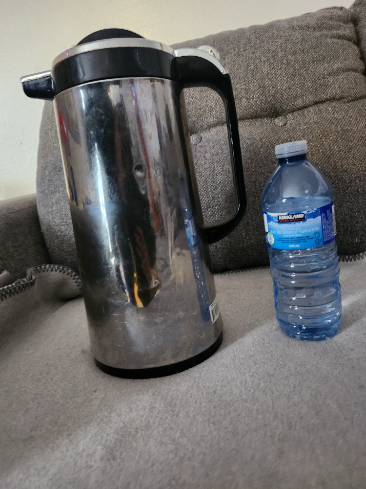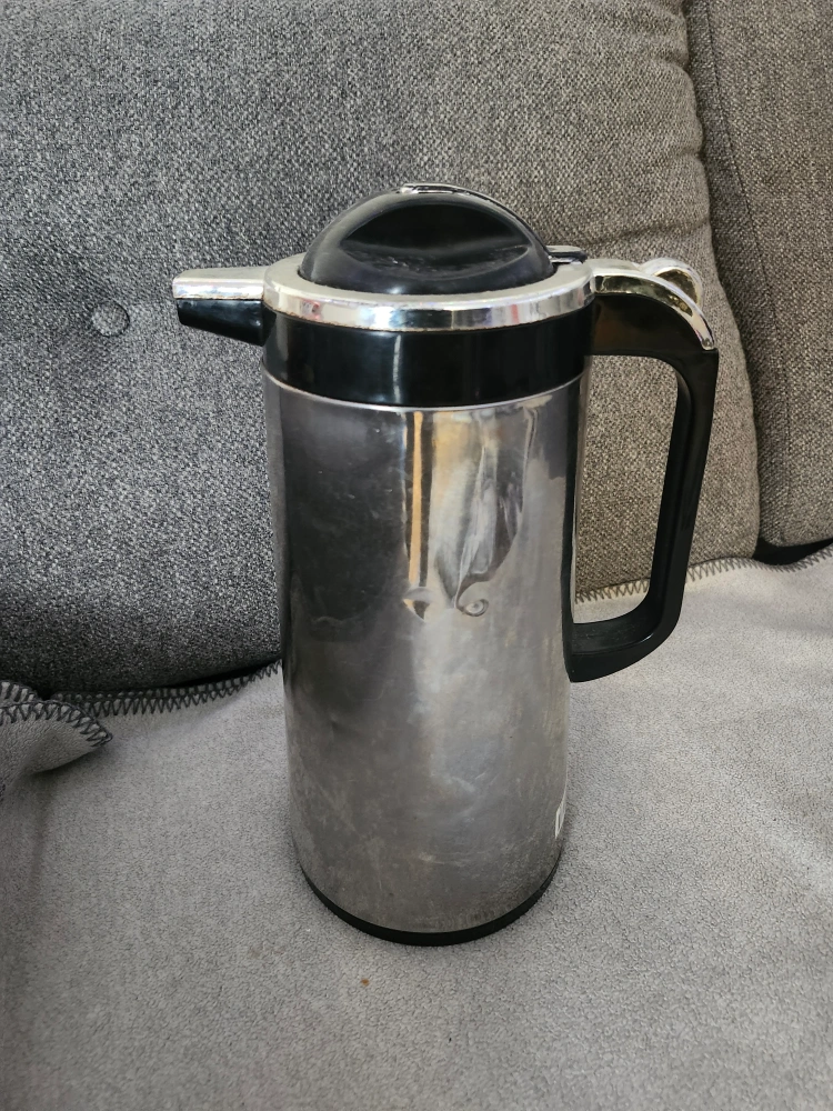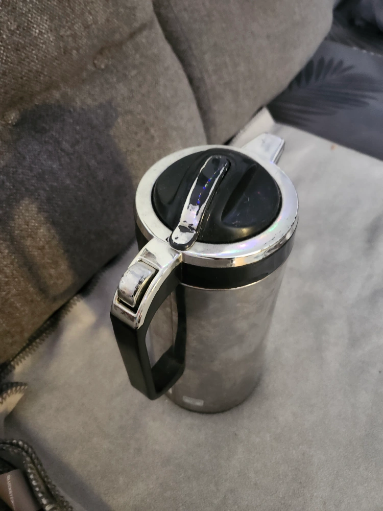 Keeps beverages hot or cold. Features a stainless steel body, black plastic accents, and a swing-top lid. Good for serving coffee, tea, or water.