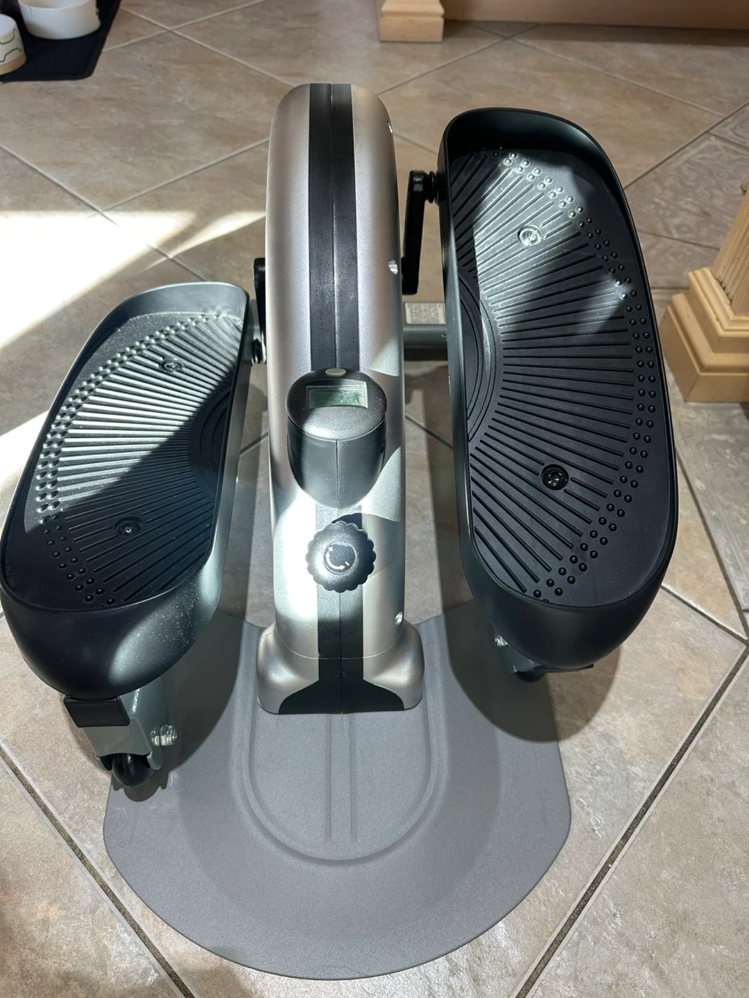 Product Dimensions - 43.2D x 62.2W x 29H Centimetres Material - Alloy Steel Maximum weight recommendation - 113.4 kg -Compact, lightweight elliptical trainer for the home or office -Foot-pedal-only chassis fits handily under a desk or in a closet -Low-impact design protects back, knees, hips, and ankles. Areas of targeted training are - -Cardiovascular fitness and toning -Electronic monitor tracks strides, exercise time, and calories Originally purchased for $210.