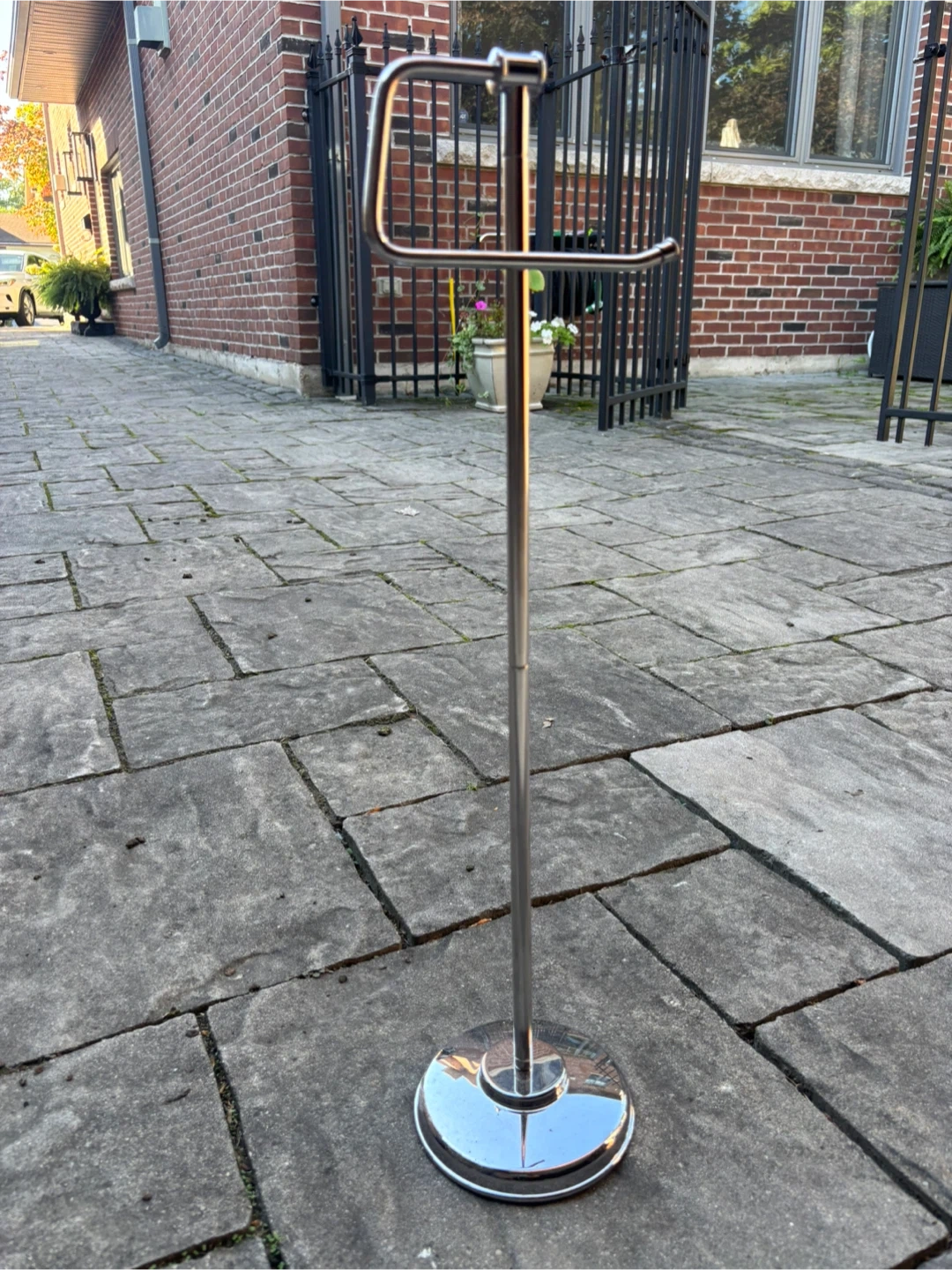 Here's a standing toilet paper holder with a sleek chrome finish! It's brand new (no box) and ready to use in your bathroom. A simple and practical addition to any home