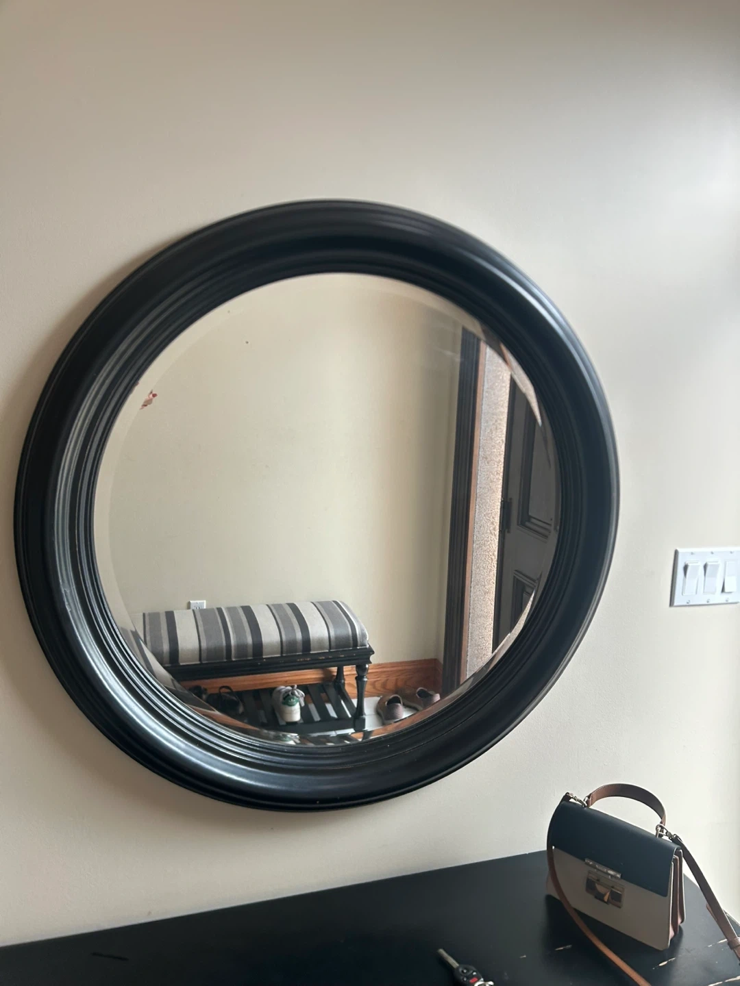 Selling a round mirror with a black frame. It's in great condition and would look lovely in any room! It's a stylish and functional piece to add to your home decor