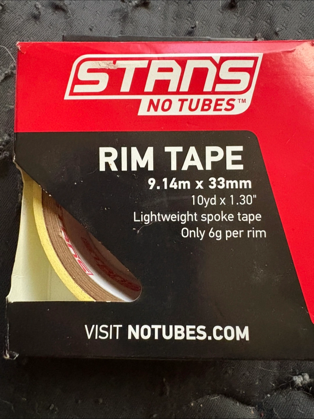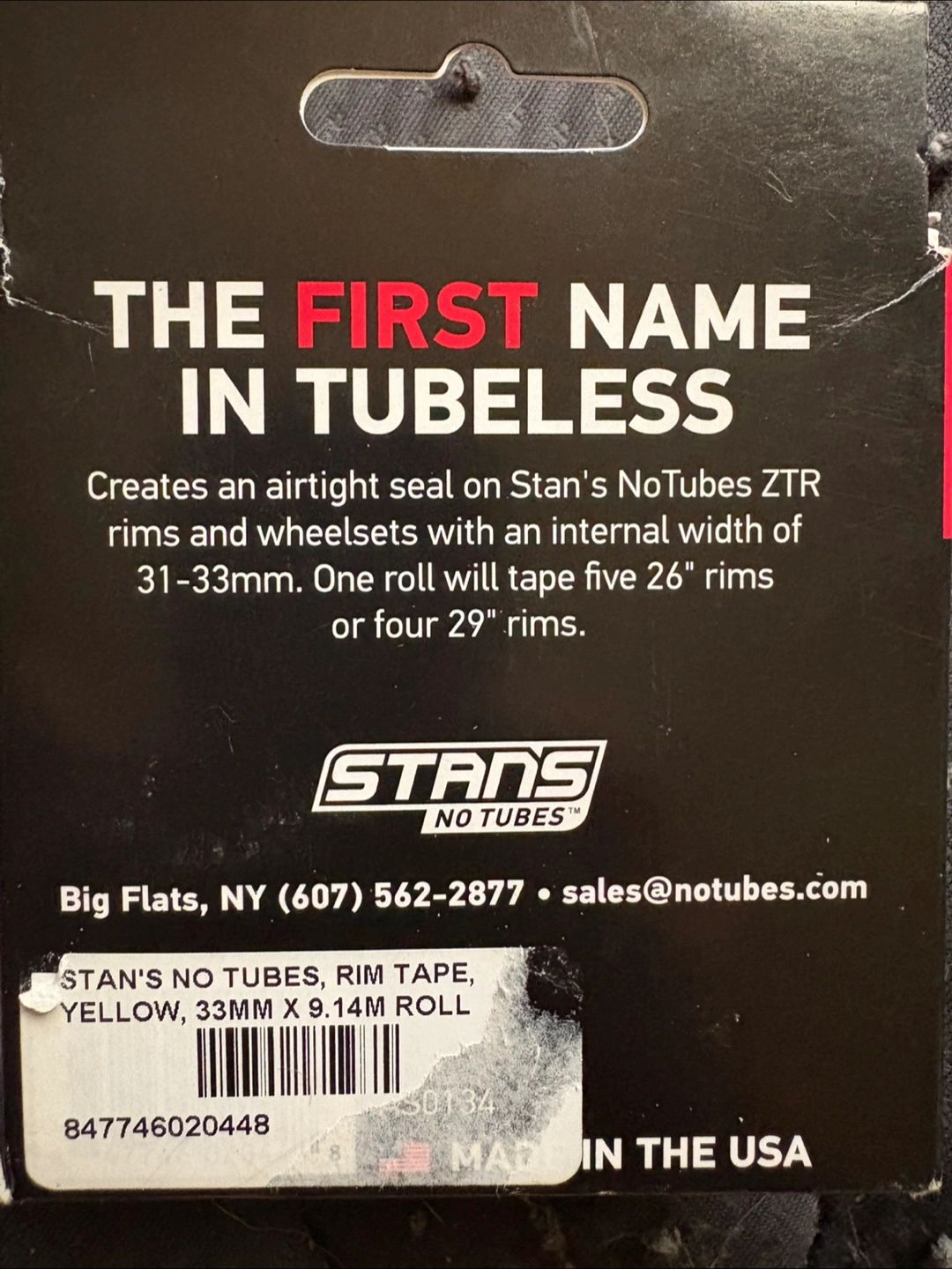 Selling a roll of Stan's No Tubes rim tape. It's 9.14m x 33mm. This lightweight spoke tape only weighs 6g per rim. It creates an airtight seal on Stan's NoTubes ZTR rims and wheelsets with an internal width of 31-33mm. One roll will tape five 26" rims or four 29" rims