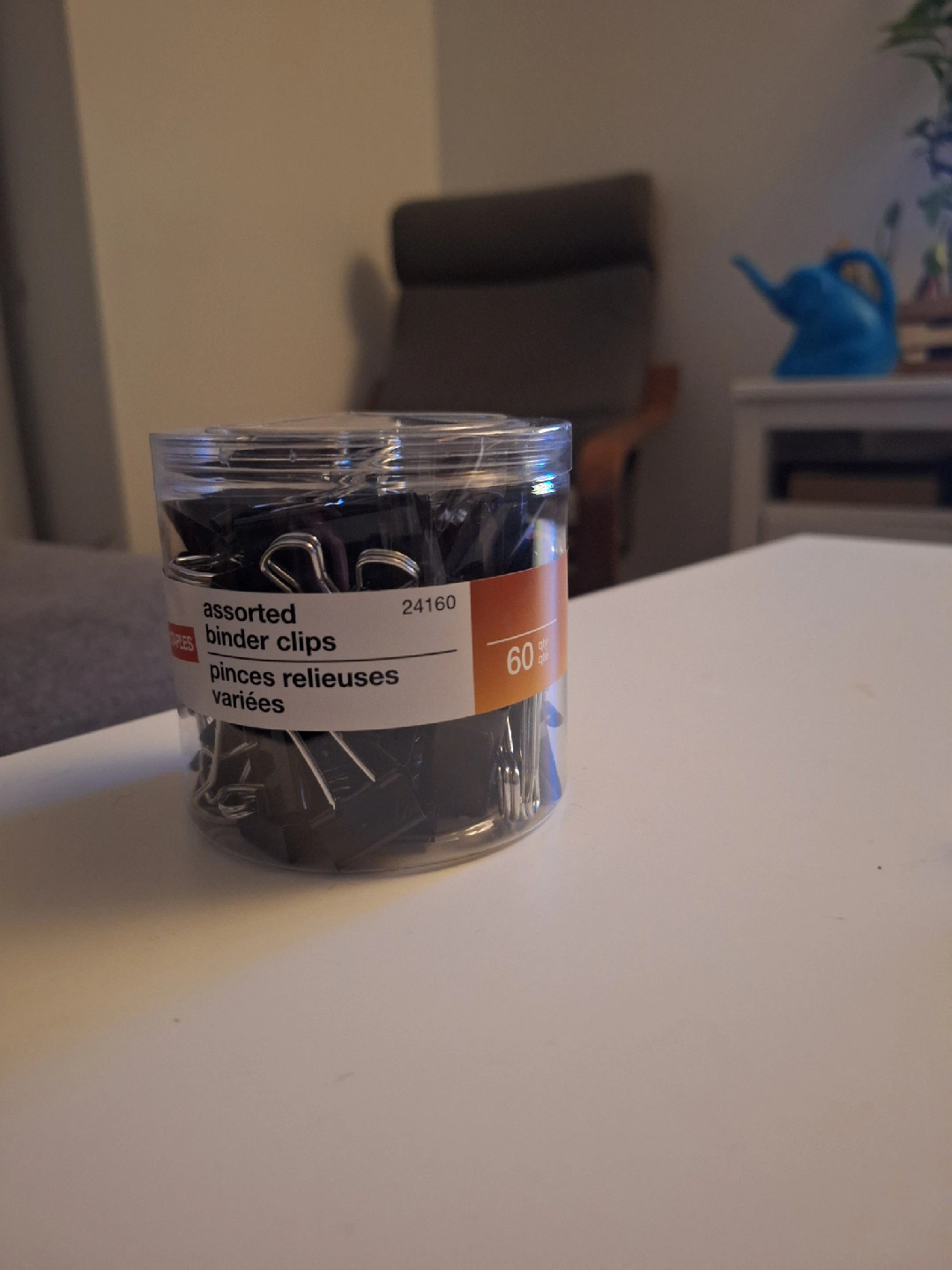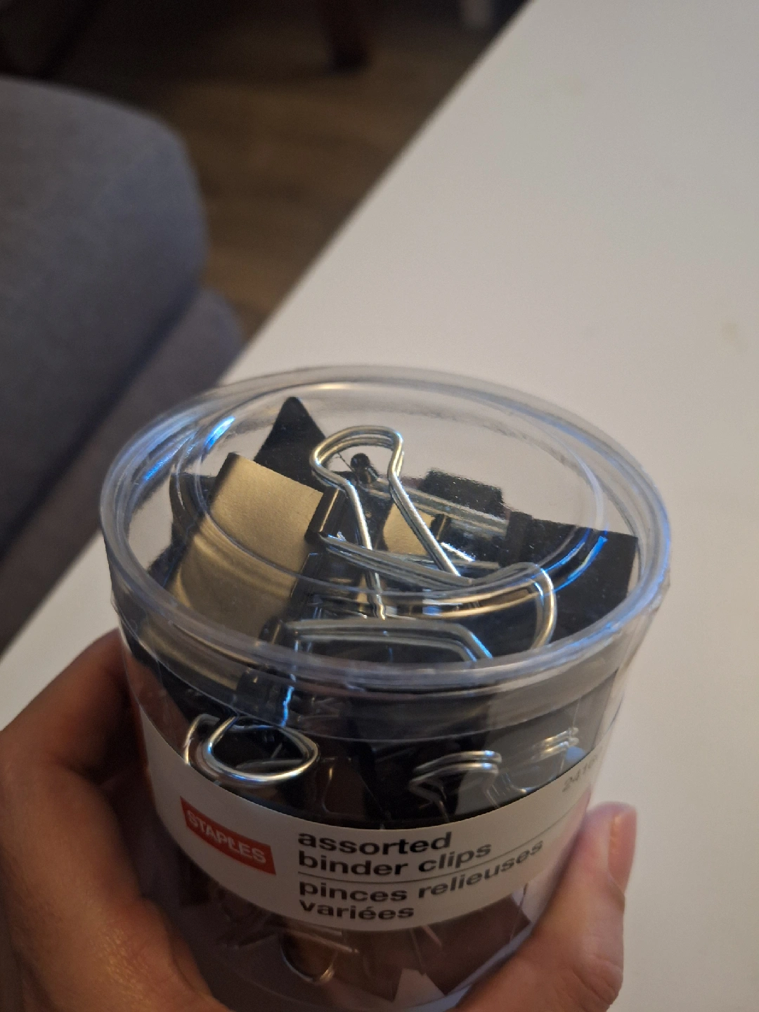 Selling a container of Staples assorted binder clips. The container says it has 60 clips, so it should be close to that amount! Great for organizing papers or sealing bags