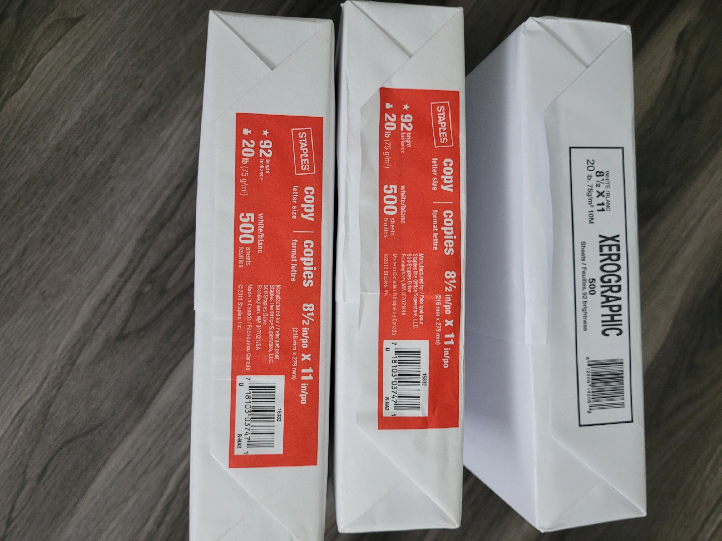 Selling a few packs of Staples and Xerographic copy paper. Each pack contains 500 sheets of 8.5 x 11 paper. Great for home or office use! Buy all 3 unopened packs for 5$ Pick up near Colebrook Elementary School Panorama West