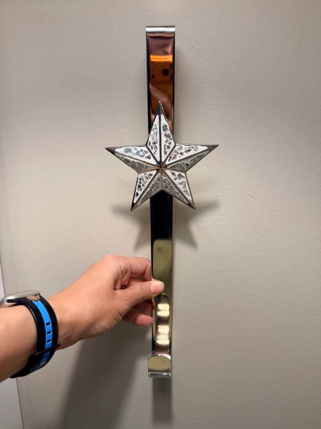 Add a touch of sparkle to your door with this star ornament door hanger! It's perfect for hanging wreaths or other decorations during the holidays or any time of year. The star is a lovely accent, and the hanger is easy to use on most doors. Only available for pick up.