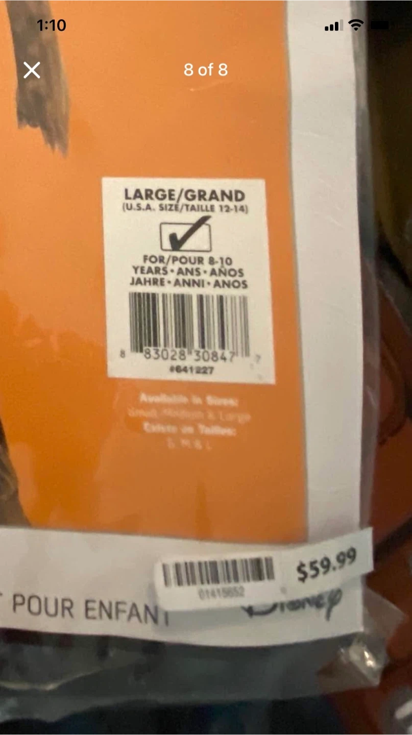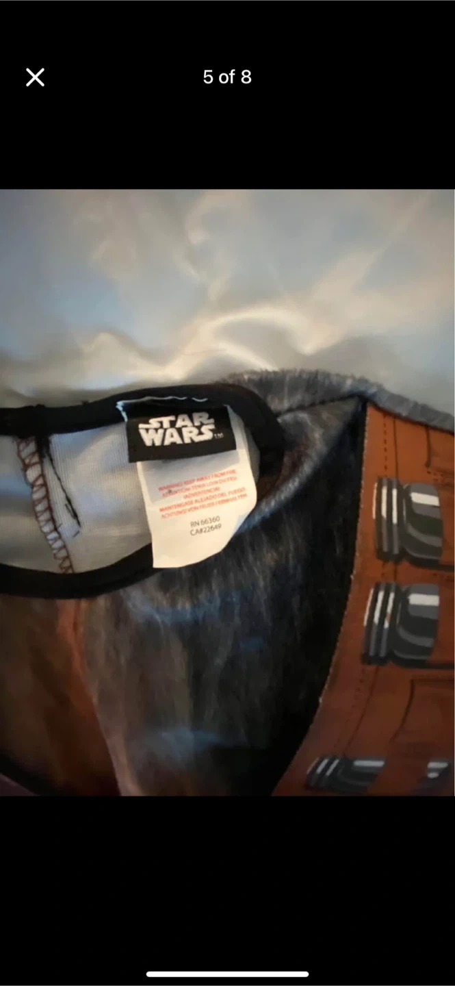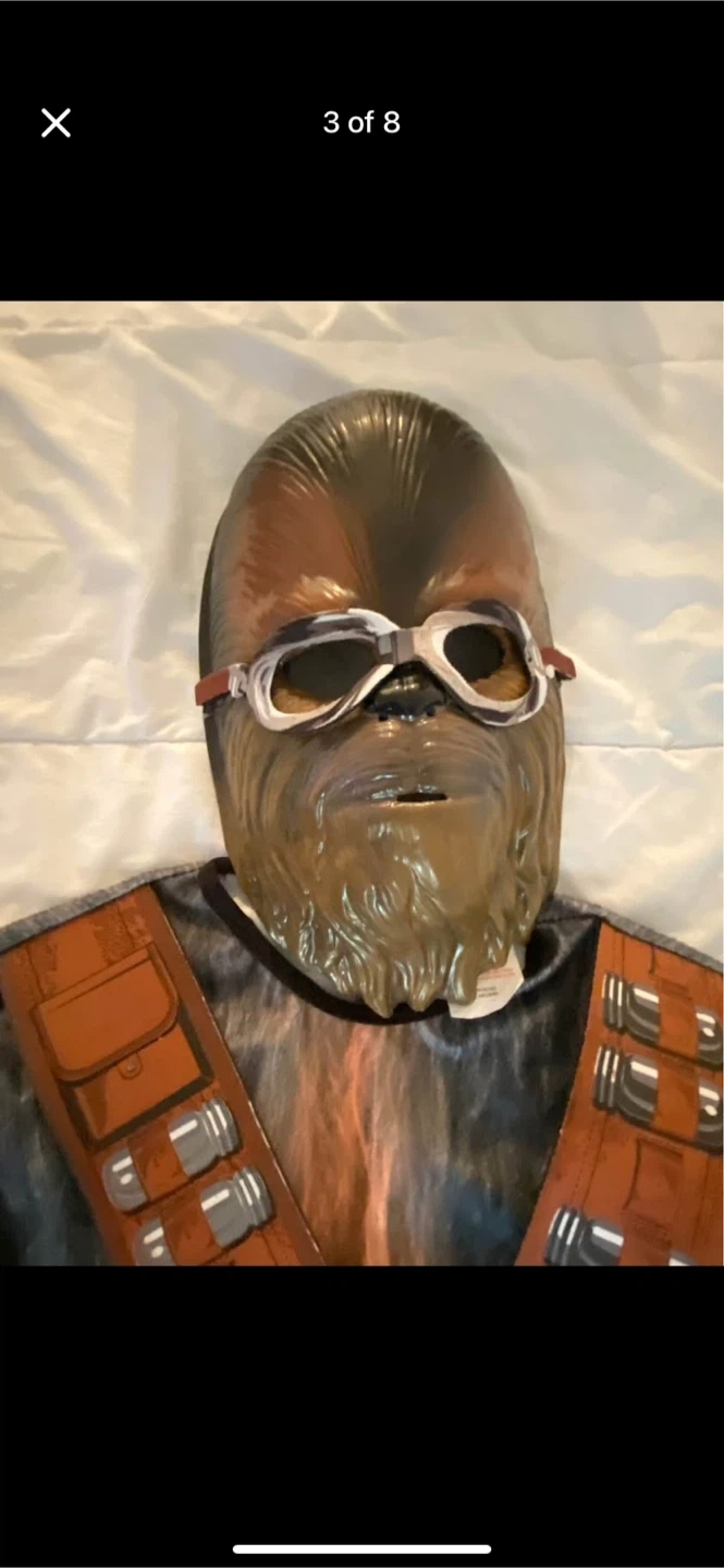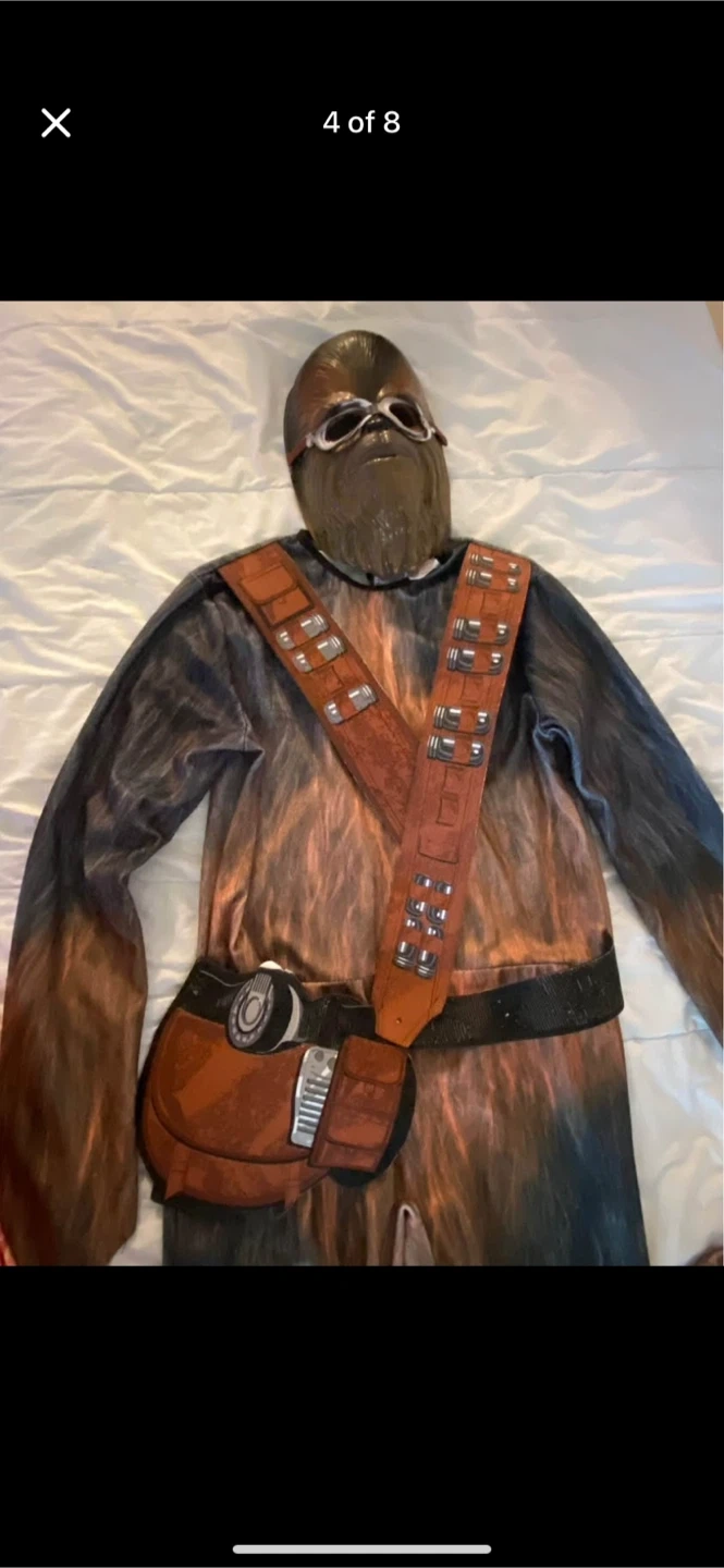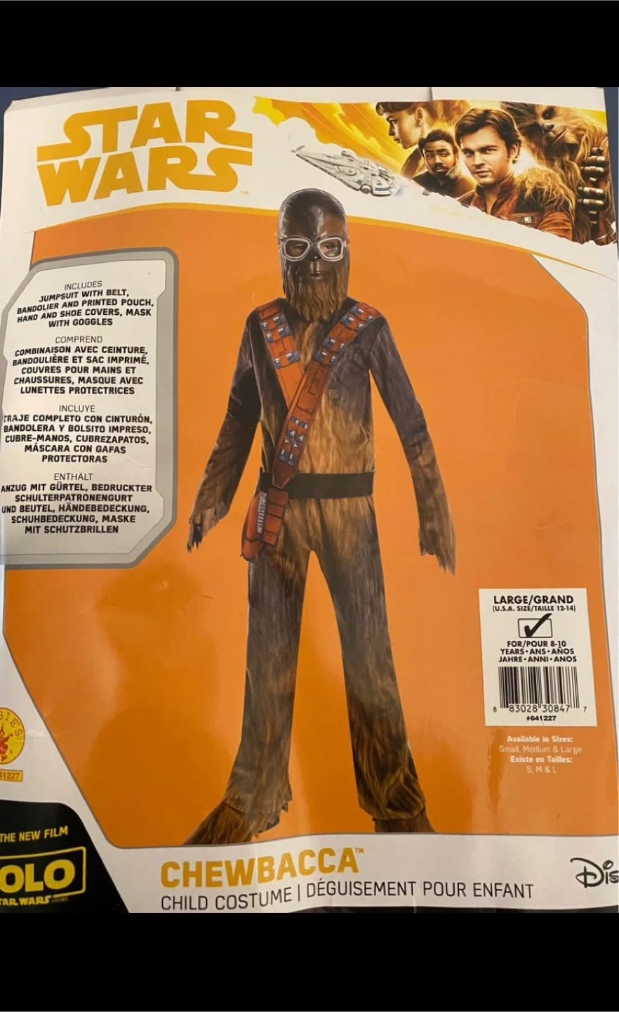Selling a Star Wars Chewbacca child costume in size Large (U.S.A. size 12-14). The costume includes the jumpsuit with belt, bandolier and printed pouch, hand and hair covers, and mask with goggles. Recommended for ages 8-10 years. Originally bought for $59.99!