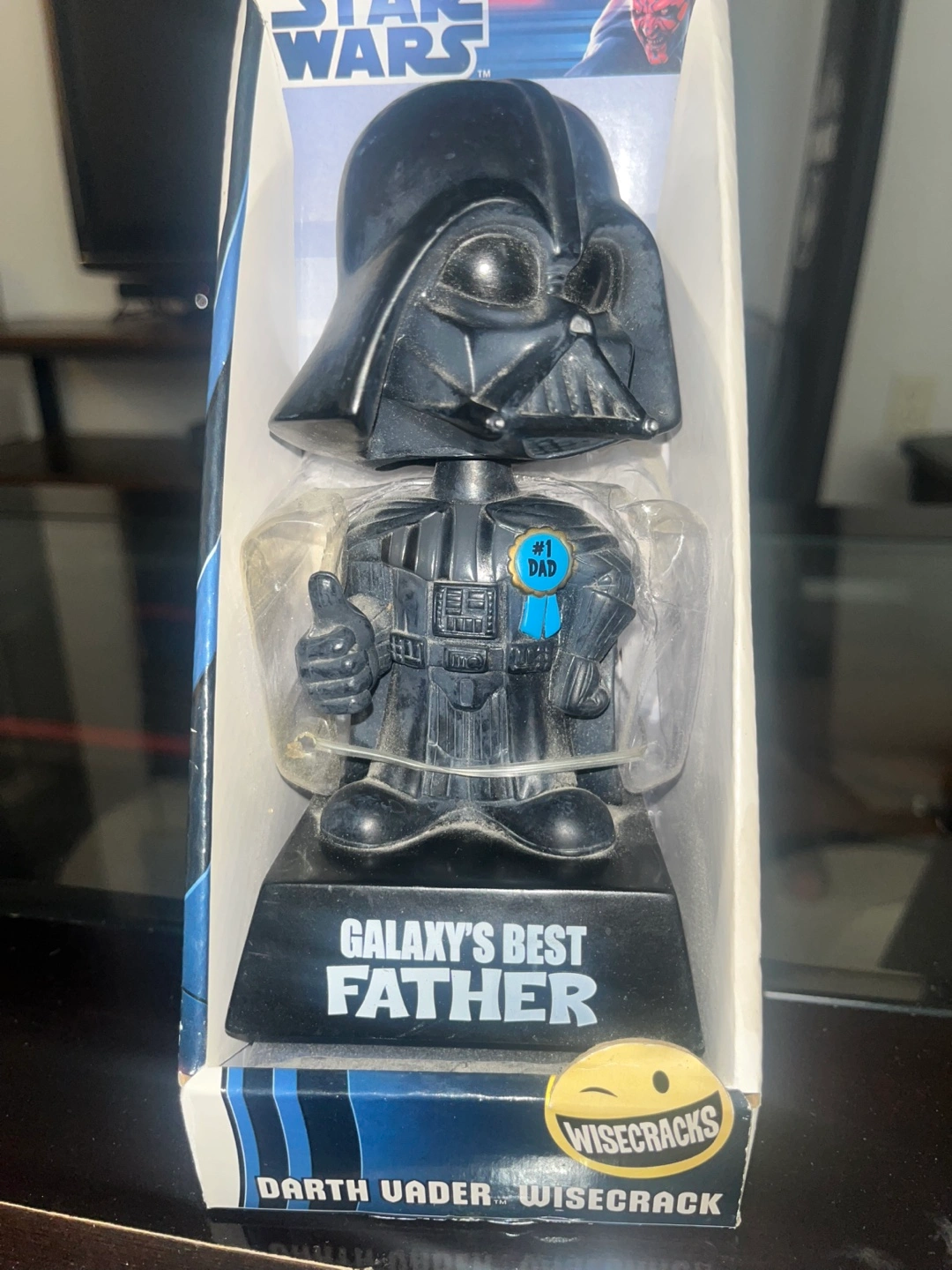 Selling a Star Wars Darth Vader Wisecracks Bobblehead! It's in great condition and comes in its original box. This bobblehead features Darth Vader with a '#1 Dad' badge and the phrase 'Galaxy's Best Father'. Bought this back when I was a kid at Disney World
