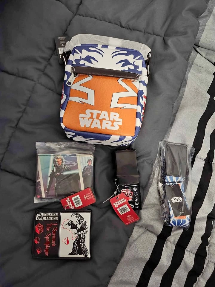 Star Wars Ahsoka Tano Disney Merch and Dungeons & Dragons Merch. All of them are brand new and never used. Ahsoka Tano Disney Merch Bag - $50 Belt - $20 Wallet - $15 Dungeons & Dragons Belt - $20 Wallet - $15 $110 for all of them. Prices are firm. I am around Barrhaven and after 6:30pm weekdays at St. Laurent. Thank you